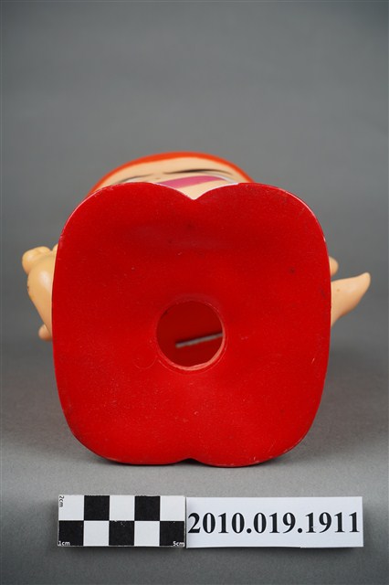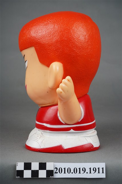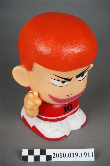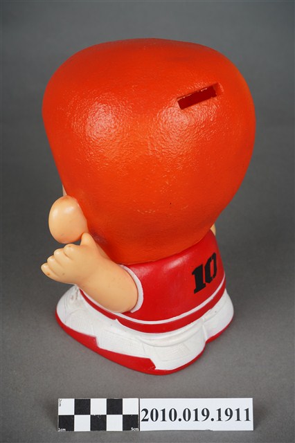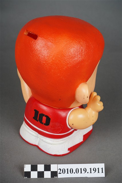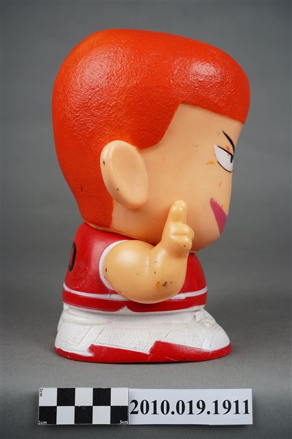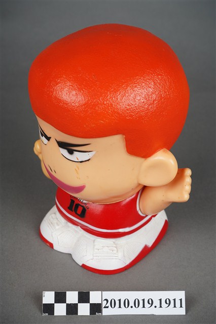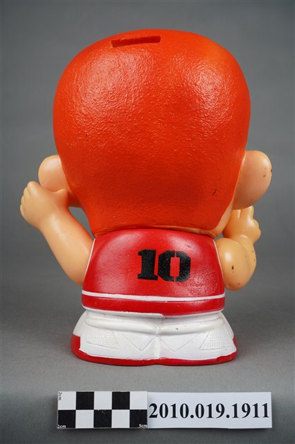 1.本物件為櫻木花道玩偶存錢筒,材質為塑膠,頭髮為紅色,眼睛與眉毛為黑色,表情呈現笑臉,右手比出二的手勢,身穿十號紅色籃球衣,腳穿白色球鞋。頭頂有一投幣孔,可將硬幣投入存錢筒,底部有開一圓形孔洞,可將硬幣從孔洞拿出,但無塑膠塞。