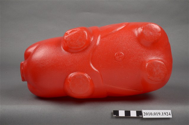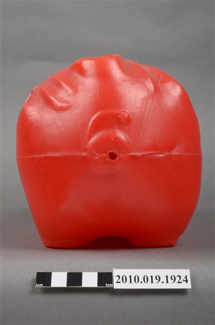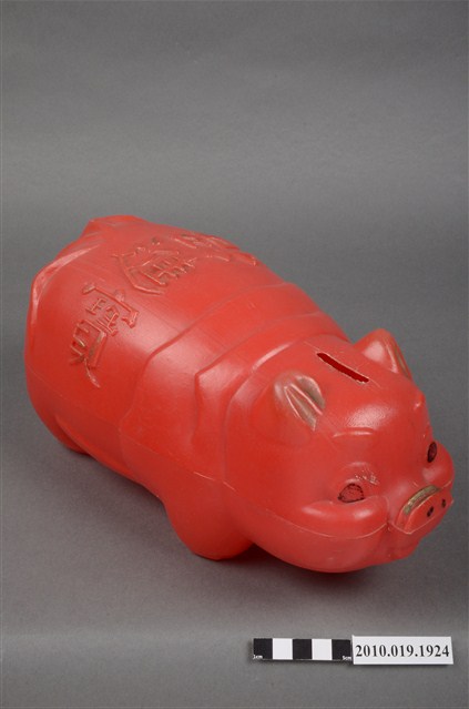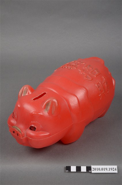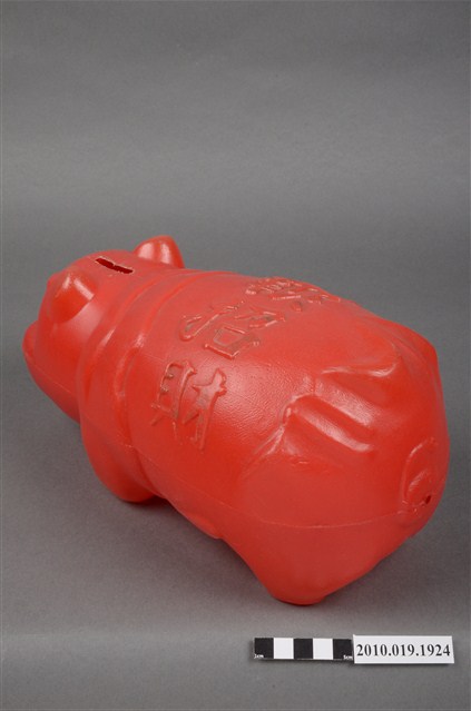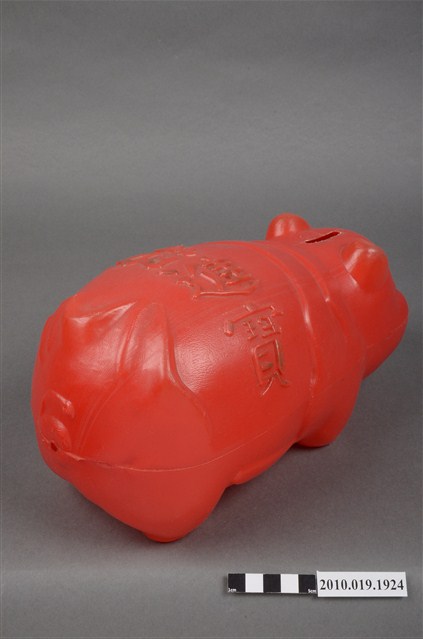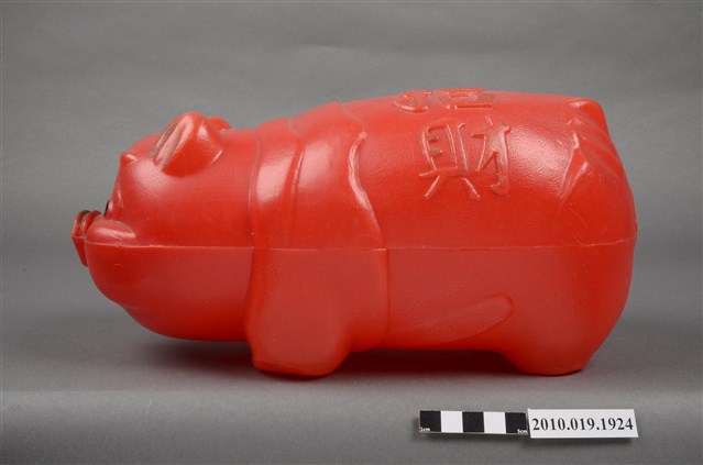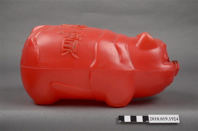 1.本物件為紅色豬造型存錢筒,塑膠製,眼睛部分為以黑色塗料畫成,背部有「招財進寶」四字,底部有「吉」字樣。