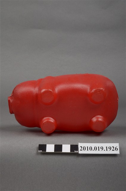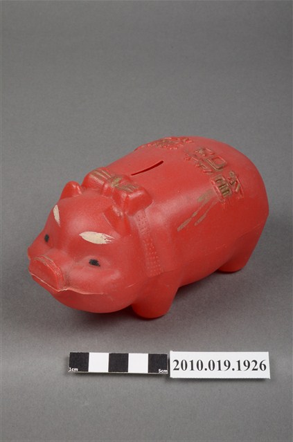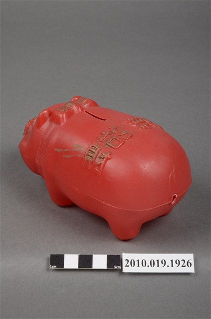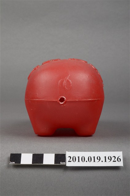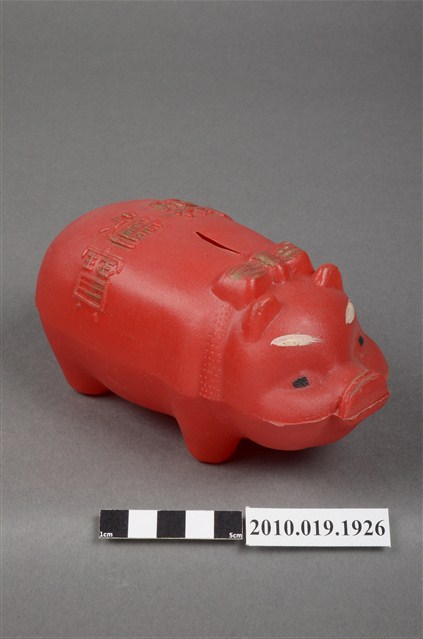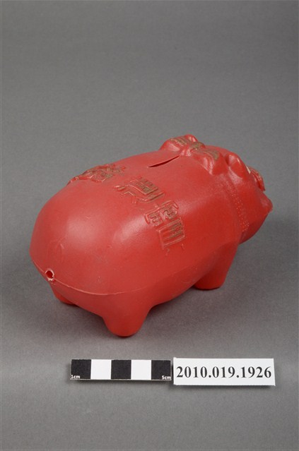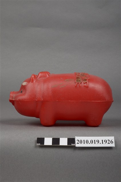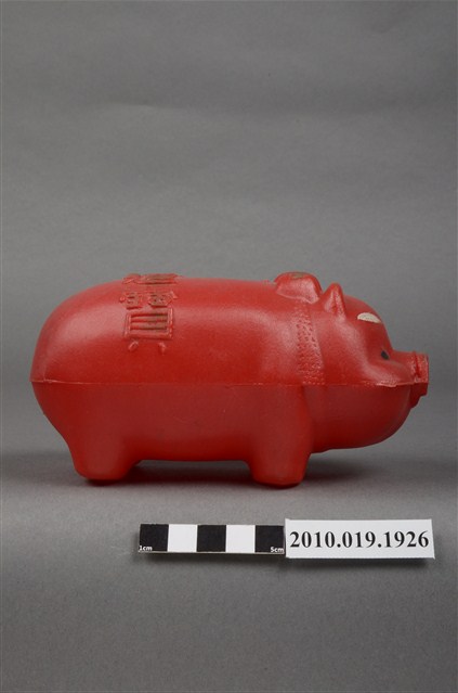 1.本物件為紅色豬造型存錢筒。塑膠製,背部有「招財進寶」四字,脖子圍有紅色蝴蝶結,有黑色眼睛與兩道白眉毛。