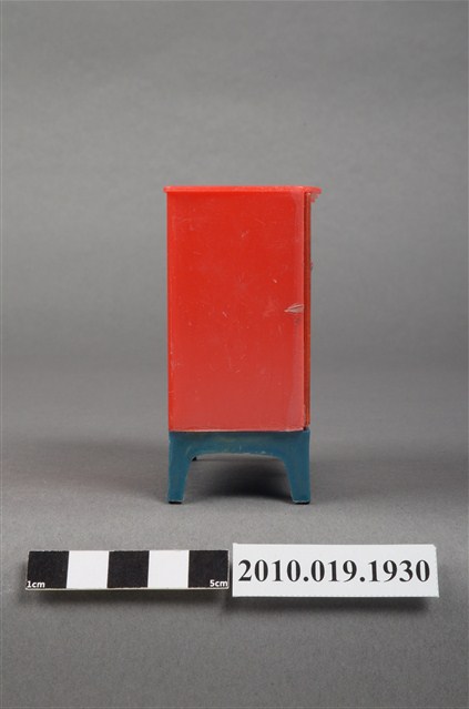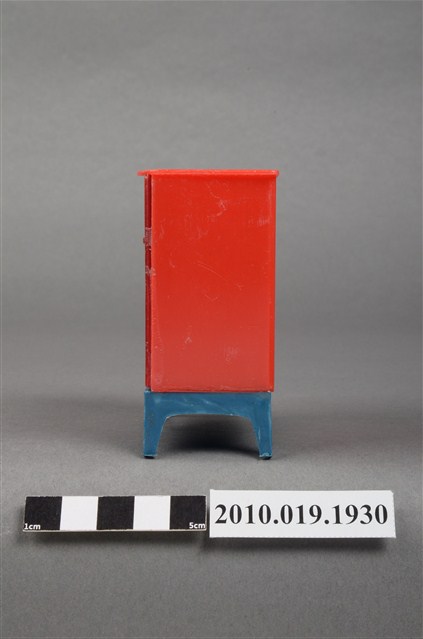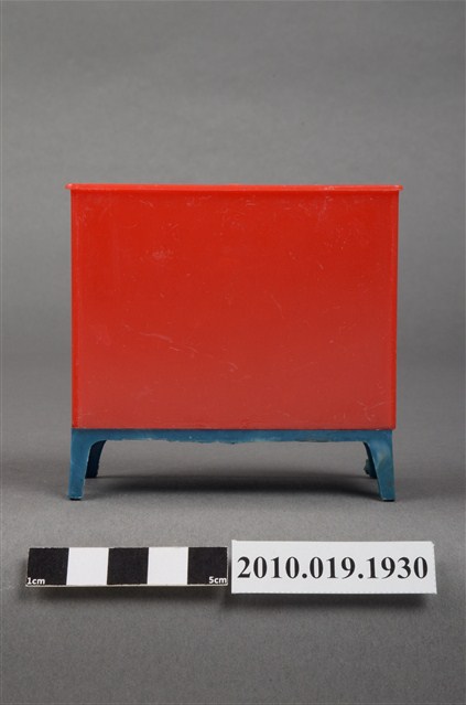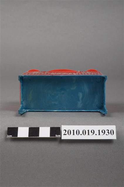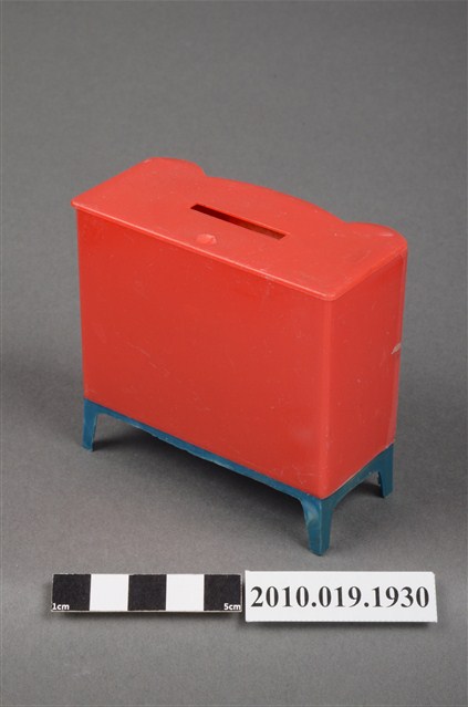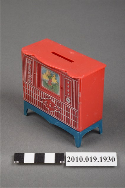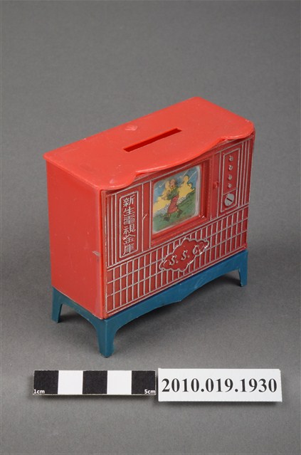 1.本物件為電視造型存錢筒,材質為塑膠,整體以早期映像管電視機造型呈現。電視機為紅色,正面有一張彩色圖片,繪著電視動畫大力水手的女主角奧莉薇(Olive)在草地上走路的樣子作為電視畫面,左邊有「新生電視金庫」字樣,右邊有一排仿電視開關旋鈕圖案,在圖片下方有「S.S.C.」字樣圖案,電視機正上方有一長方形孔洞可投零錢,而底下連著一個藍色的腳架。