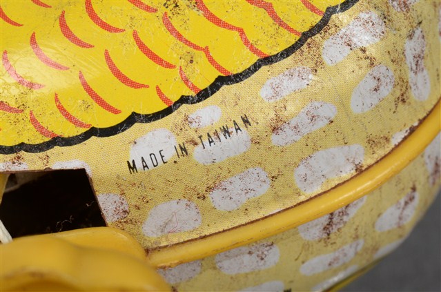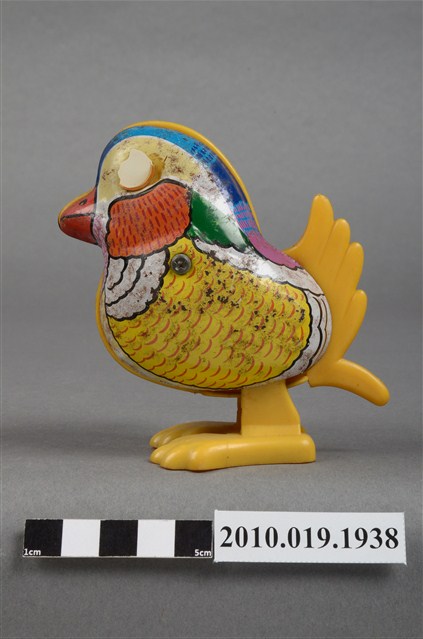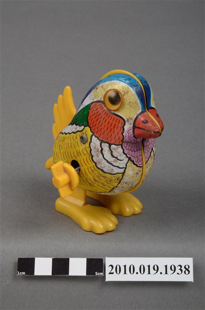 1.本物件為金屬發條鳥造型玩具,以鳥的造形呈現,顏色為五彩繽紛,藍色的頭頂,紅色的嘴巴,鳥的左眼已經不見,在鳥的右側有黃色發條,鳥的腳為黃色,呈現站立狀,鳥的背面並有「MADE IN TAIWAN」字樣。