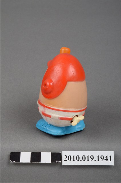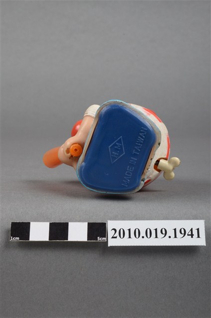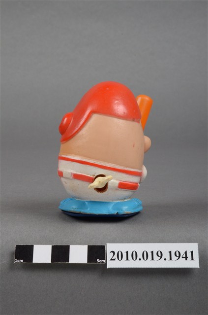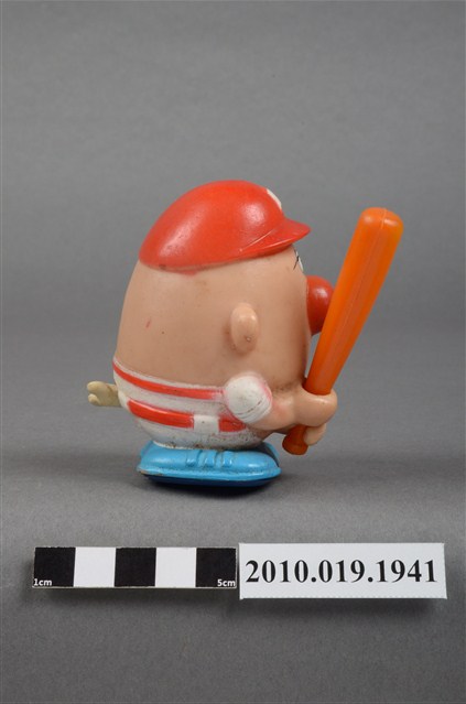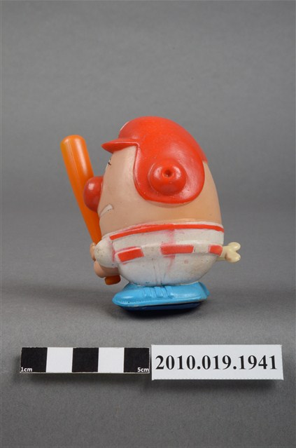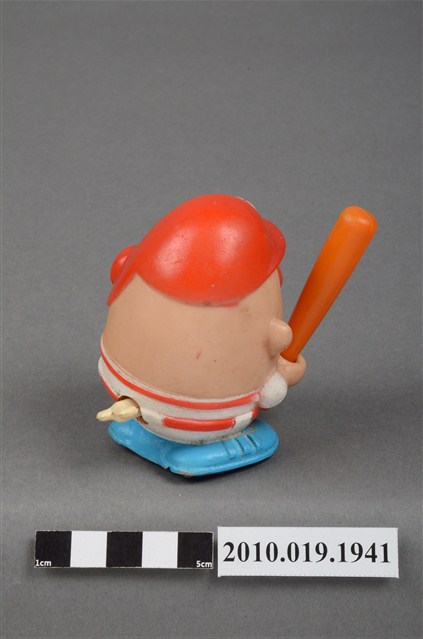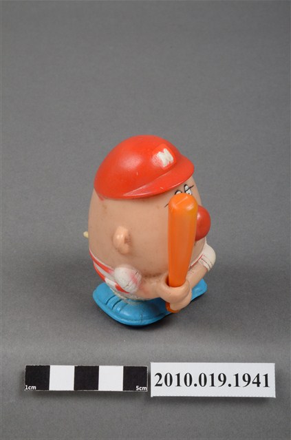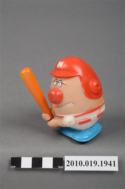 本物件為棒球造型玩具,兩眼較小,紅鼻子並齜牙,頭戴紅色棒球帽,身著白底滾紅色線條之短袖上衣,下身則為藍色,雙手握著棒球棍,娃娃背部有上發條之螺絲頭,底部寫有「H.M」,「H.M」推測為玩具公司縮寫,下方有「MADE IN TAIWAN」字樣。