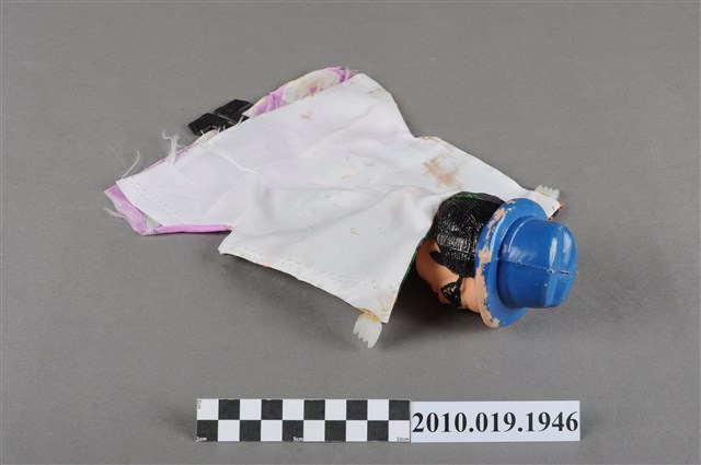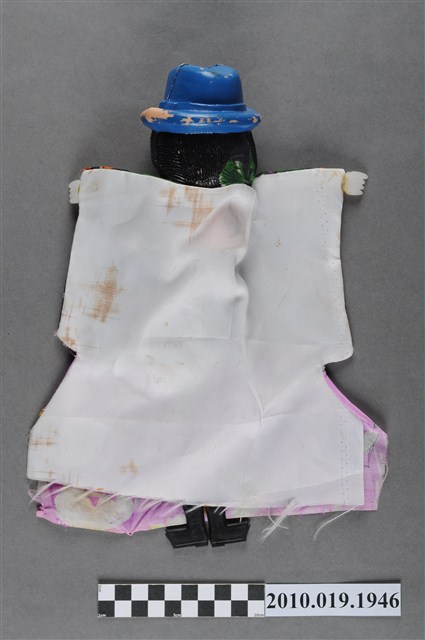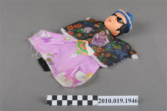 1.本物件為藍帽墨鏡造型布袋戲偶,黑色頭髮並戴墨鏡,頭上戴有藍色帽子,帽緣有些掉漆,身著黑底花布,花朵主要為橘色以及紫色,下身則穿淡紫色,其布樣有船及鴨子圖案,衣服中間並有綠色獅頭貼紙,但有一半已毀穩,著黑鞋。