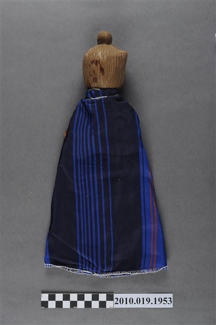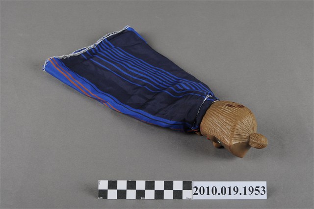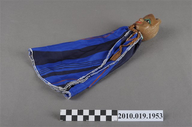 1.本物件為藍袍咖啡色布袋戲偶,咖啡色臉,濃眉大眼,並畫有綠色眼影,紅唇嘟起,並在額頭中間有紅色印記,頭髮向後梳成高髮髻,身著藍黑相間之披風,披風綁戴處為咖啡色。
