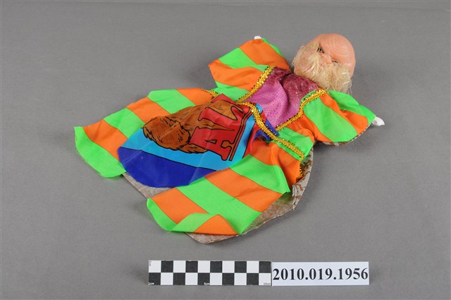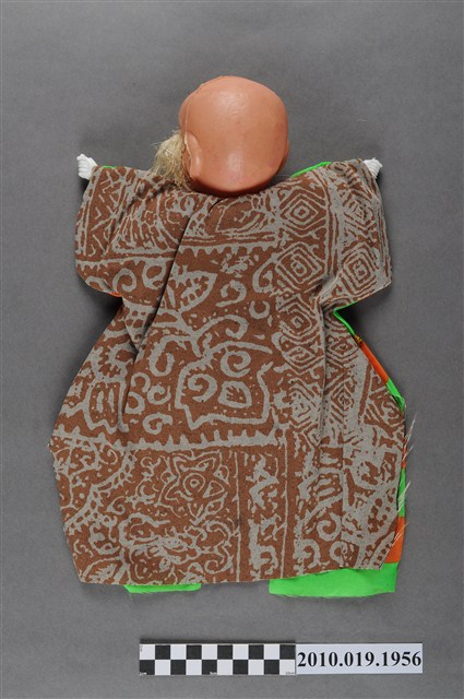 1.本物件為白眉無髮布袋戲偶,其代表角色為「末」,白眉長過眼遮臉,頂上無髮,身著橘綠相間之服裝,中間及腰際有金色線條滾邊,下擺為藍底並有動物圖案,布偶背面為咖啡色圖形。