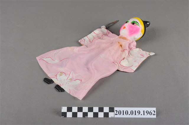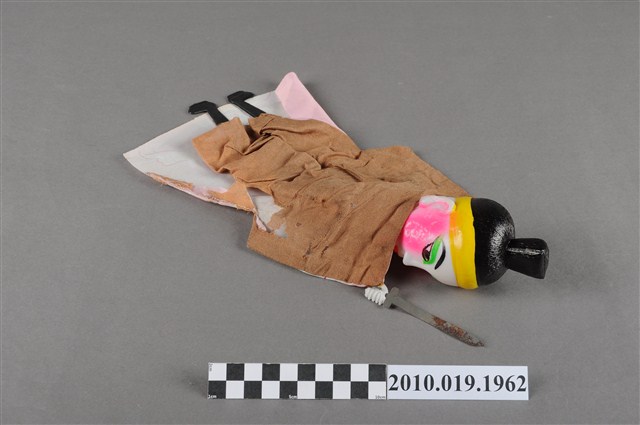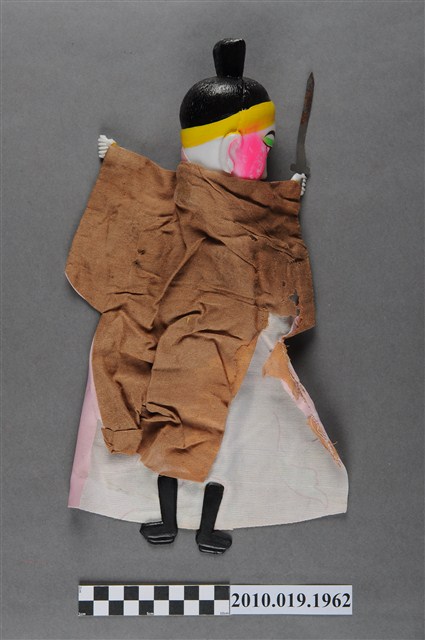 1.本物件為黃色頭巾持刀布袋戲偶,細眉大眼,並擦上淡綠色眼影,紅唇嘟嘴,並擦有明顯粉紅色腮紅,黑髮梳成高髮髻,並有1橘色髮箍箍起,身著粉色系花布,右手則握有一把刀,著黑鞋,衣服領口附近則有明顯汙漬。