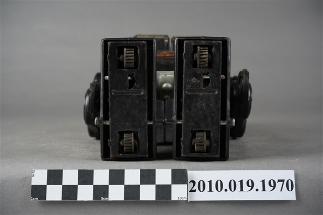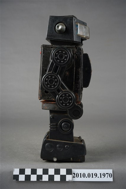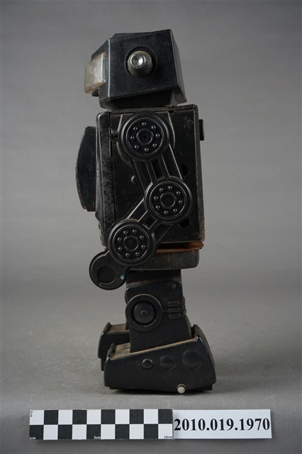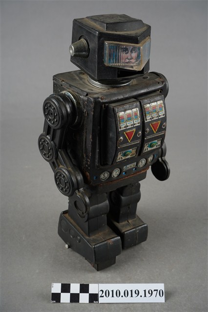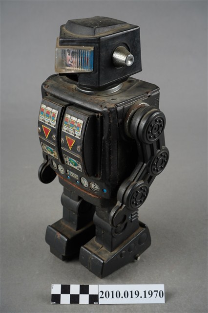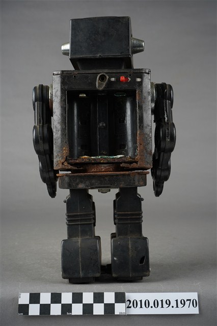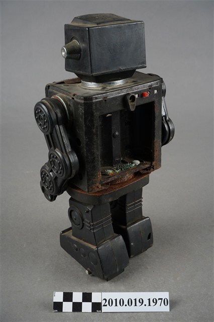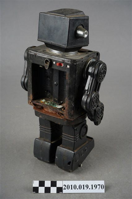 1.本物件為黑色機器人造型玩具,全身為黑色,可以分為頭、身體與腳,頭的部分前方有透明面板,兩側則有銀色耳朵,身體可分為左右面板,各有不同按鍵可以操作,背面還有置電池的盒子,盒子已經生繡,面板亦不見了,雙手由3個輪軸組成,比較好操作,腳底則各有2顆輪子,以方便行進。