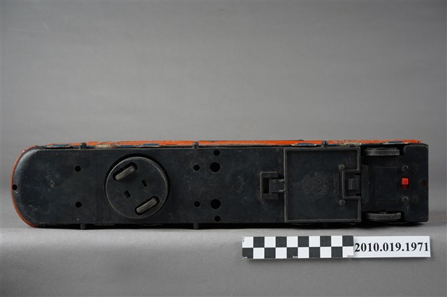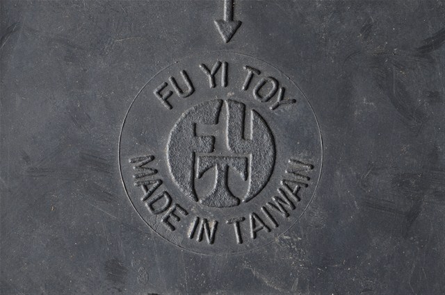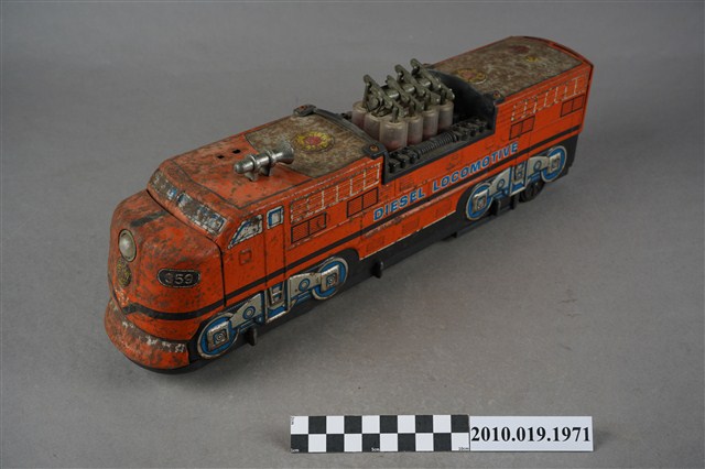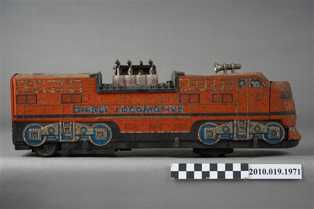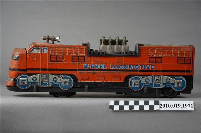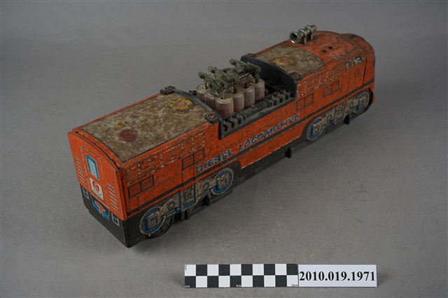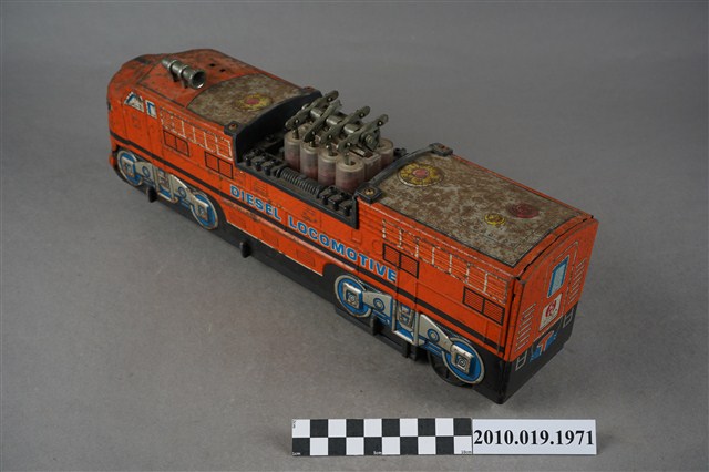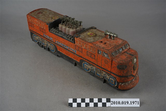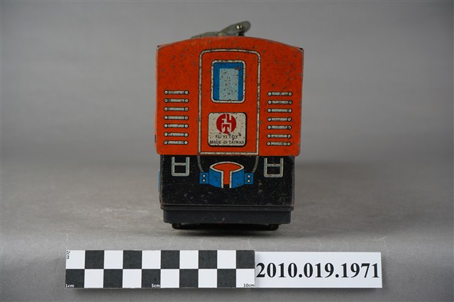 1.本物件為紅色消防車造型玩具,車身生鏽斑駁,車子共有8顆輪子,車子上方放有滅火器材,駕駛座上方有1銀色喇叭,車身寫有「DIESEL LOCOMOITE」字樣,車頭並有編號359,車子底盤有一組輪子外,還有置電池盒子,上面寫有「FU YITOY MADE IN TAIWAN」字樣。