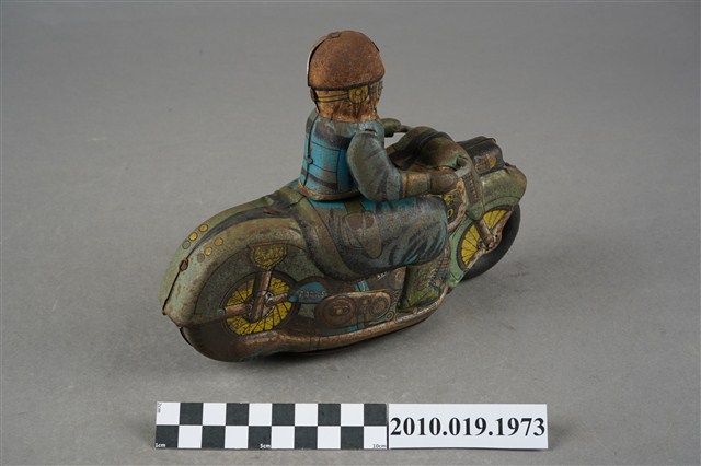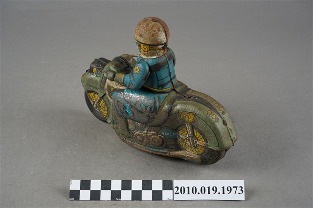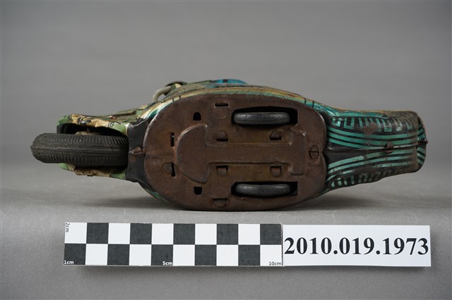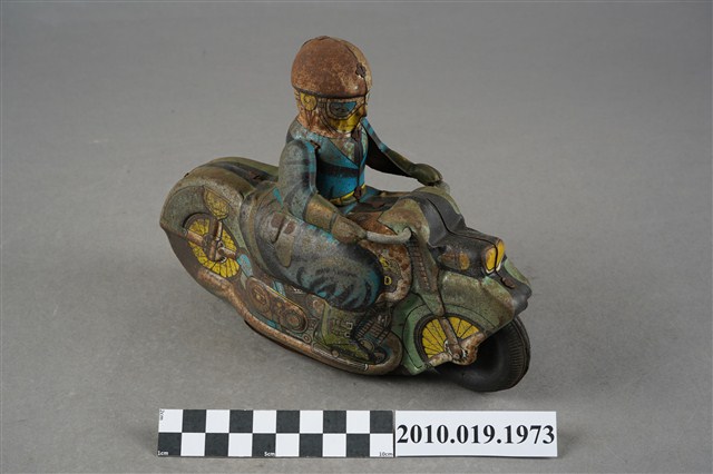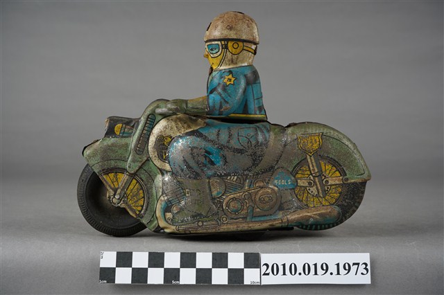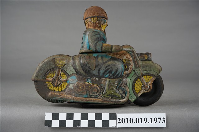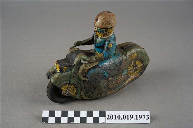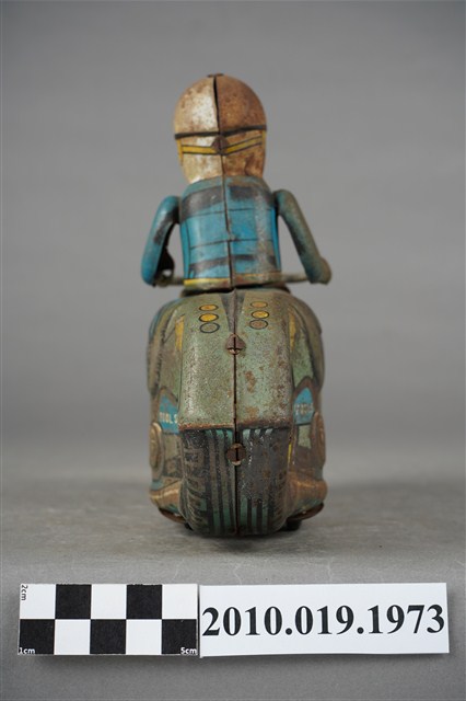 1.本物件為金屬摩托車造型玩具,造形為騎士騎機車,車身與騎士一體成形,騎士頭戴白色安全帽、護目鏡、黃色面罩,身著藍色長袖衣褲,腳上穿綠色靴子,車子斑駁生繡,車子的移動靠前輪以及底盤2顆輪子。