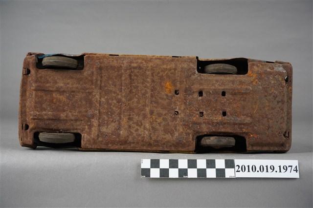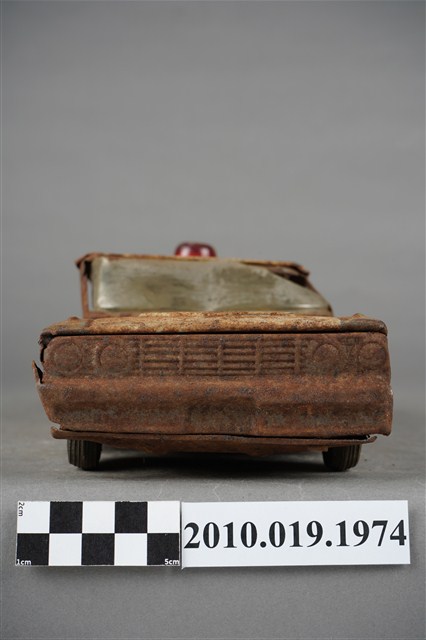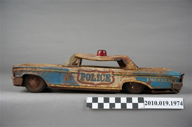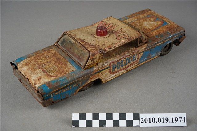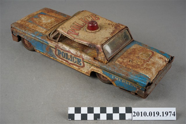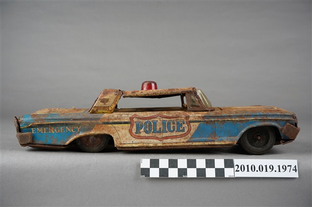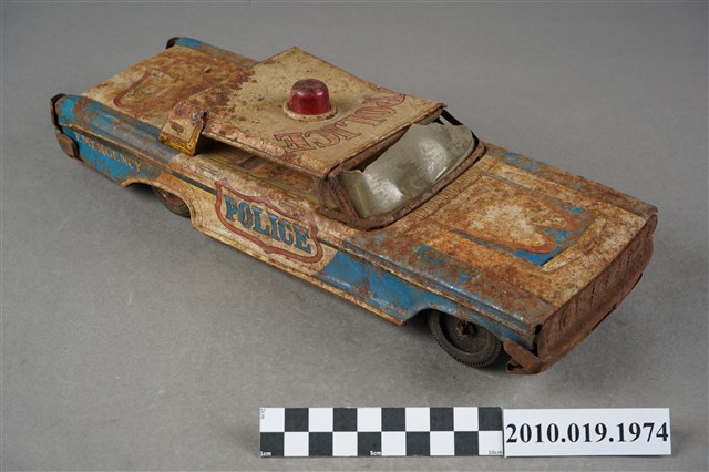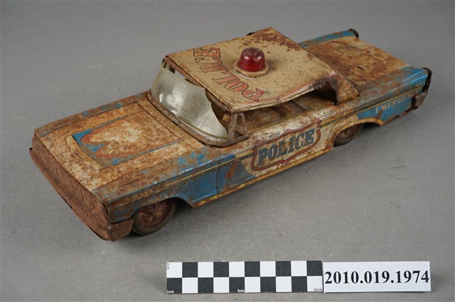 1.本物件為藍白色警車造型玩具,顏色是藍白色系為主,車子側身與車頂皆有英文字寫下「POLICE」後車箱上面有英文字「P. D.」,側身則有白色英文字「EMERGENCY」,車頂微微凹陷並有一紅色警示燈,車子擋風玻璃毀損,整輛車子已經生鏽斑駁。