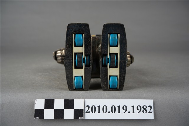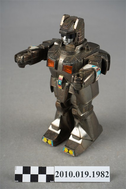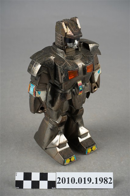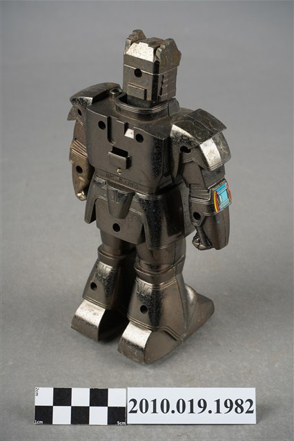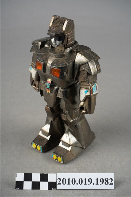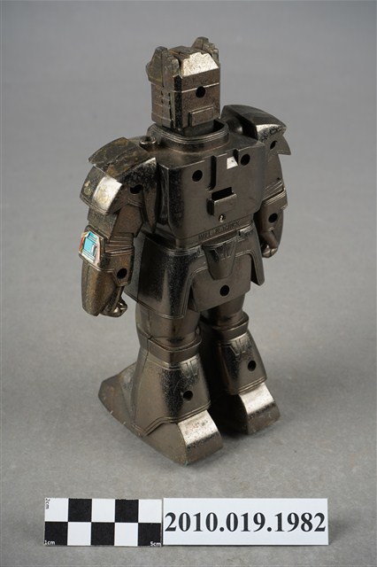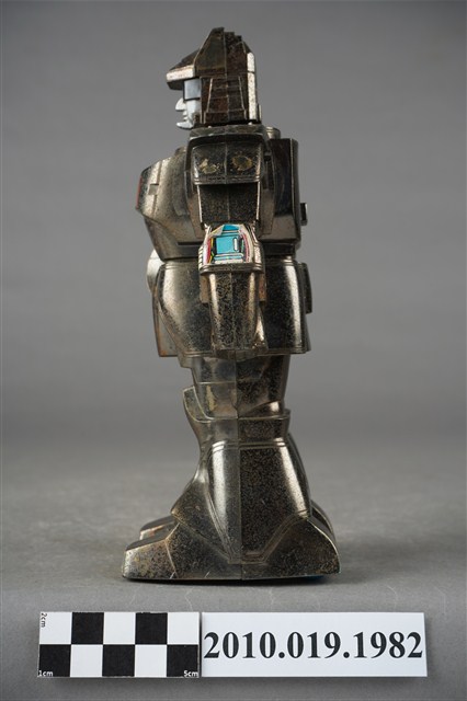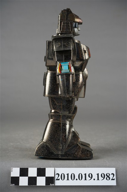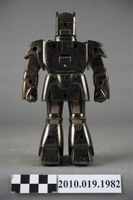 本物件為黑色機器人,材質為金屬與塑膠,呈現站姿。機器人一身的鐵灰色鎧甲,雙手握拳置於身側且可上下擺動,背後腰部位置有「MADE IN TAIWAN」字樣,上方露出小段被截斷的電線,腳底裝有輪子可使機器人行進。