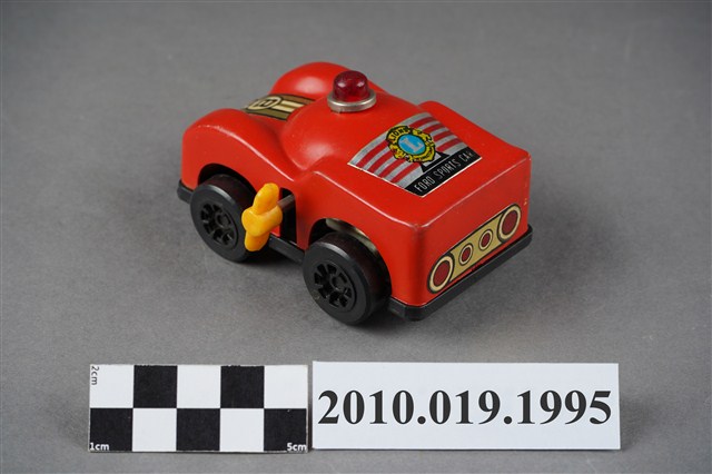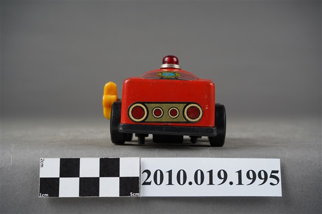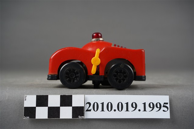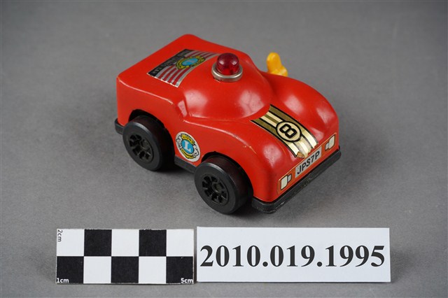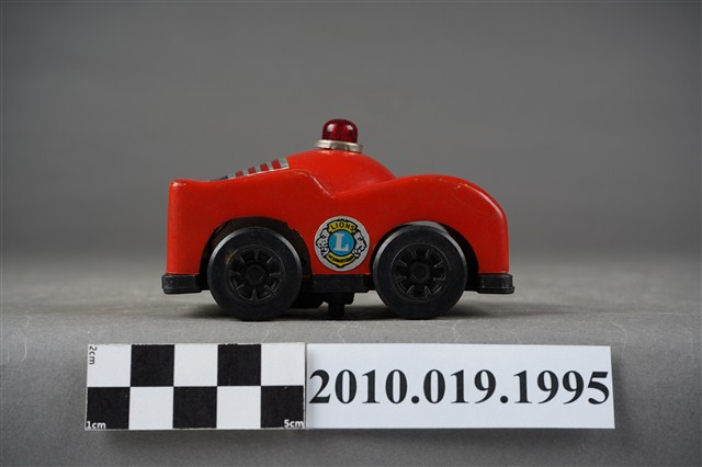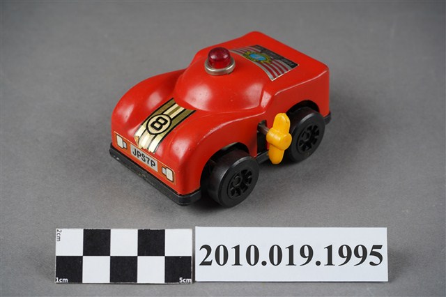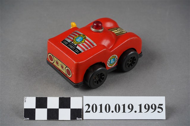 本物件為紅色汽車造型玩具,在車頂上面有紅色的警示燈,車頭蓋上有黃底黑字的「8」,後車廂上面則有黃色徽章寫下藍底白字的「L」,徽章下有「FORD SPORTS CAR」字樣,車子左側有黃色發條鈕,可以使車子前進。