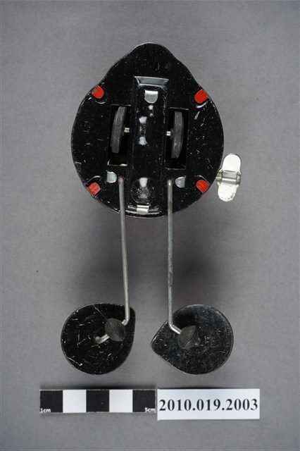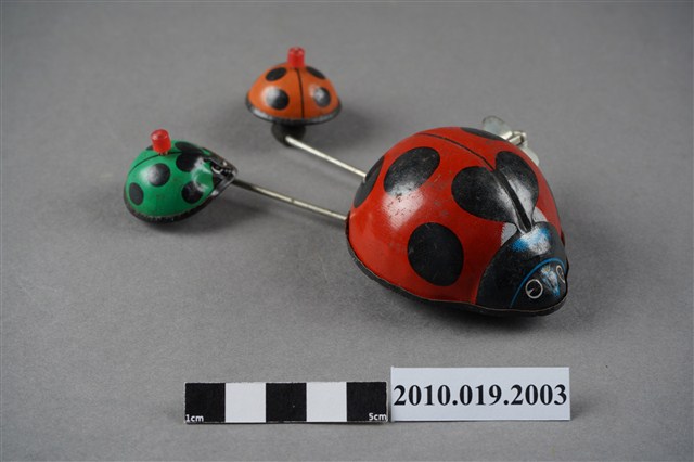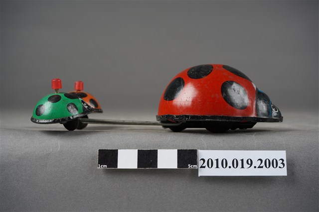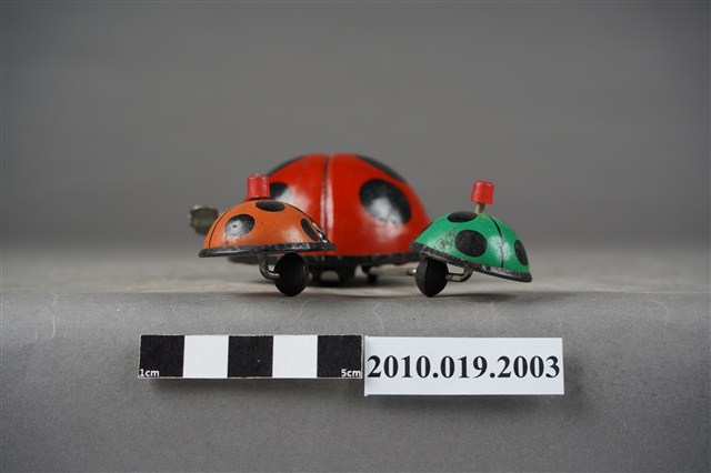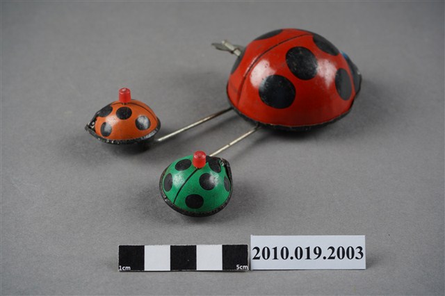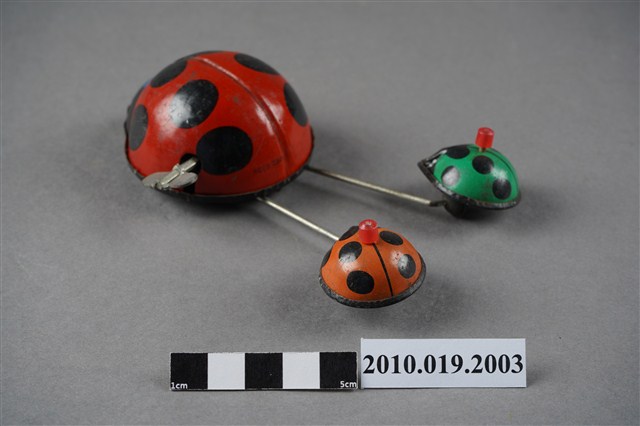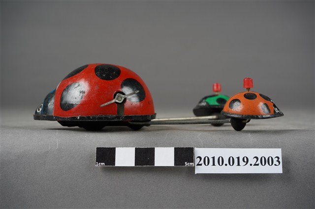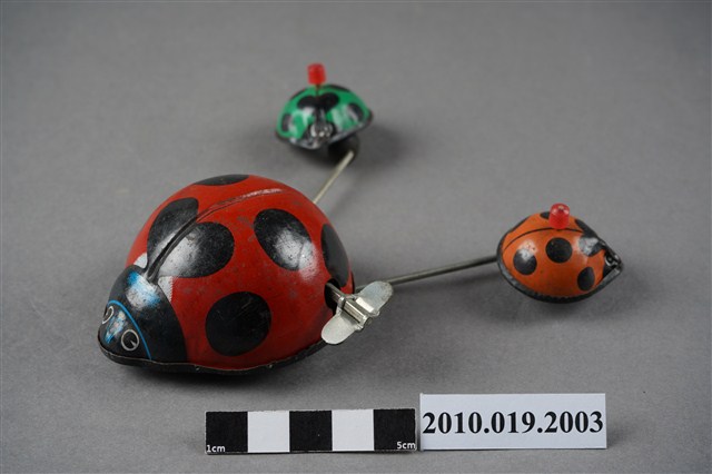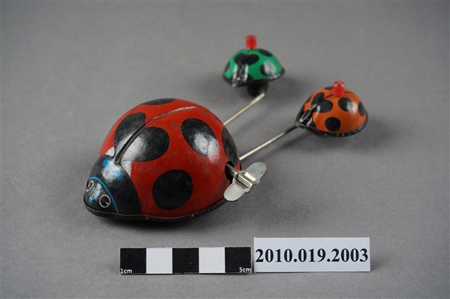 本物件為金屬發條飄蟲造型玩具,一共3隻,1大2小,最大隻為紅色,身上有黑色圓點,後面以鐵線拖著1綠1橘的小瓢蟲,同樣有黑色圓點,2隻小瓢蟲的背上都有一顆紅色的燈,每隻瓢蟲底座都有輪子,大瓢蟲的左側有銀色發條,可以使瓢蟲移動。