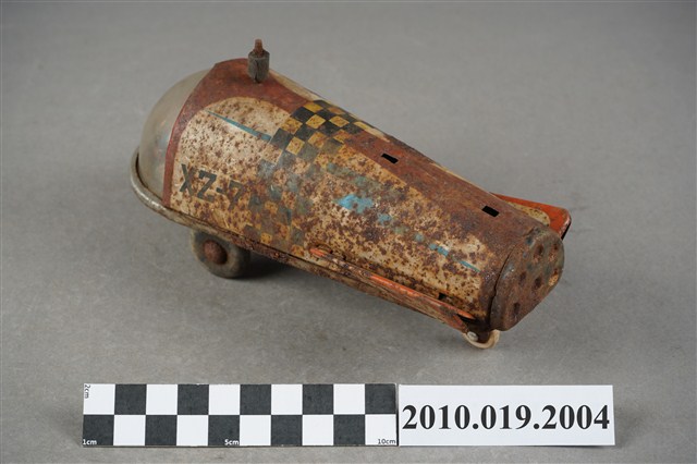 本物件為金屬製飛機造型玩具,飛機主體為長形設計,機頭的地方有泛黃的塑膠擋風板,裡面有2位駕駛員,機身前段有黑色「XZ-7」字樣,中間則為黃黑相間的格紋,機身上方有一道藍色閃電,後方兩側機翼則各有一道紅色閃電,機尾的地方設計有許多小孔象徵噴射作用,底座有2大1小的輪子使飛機移動,整架飛機生鏽斑駁不堪。