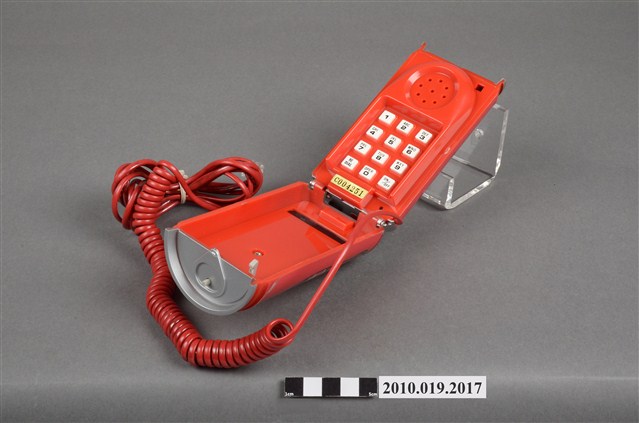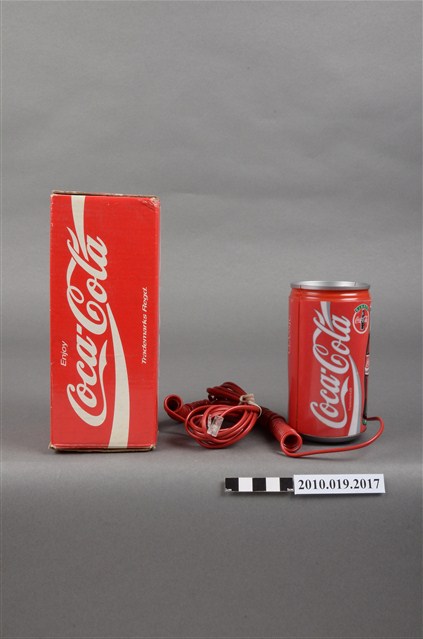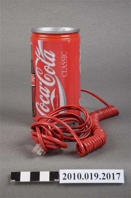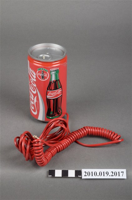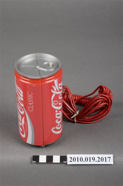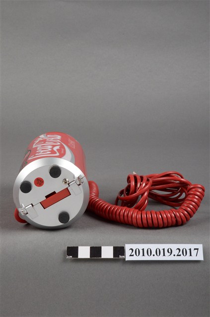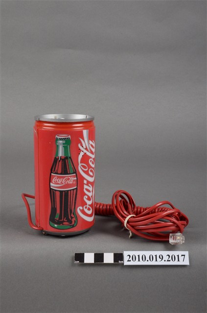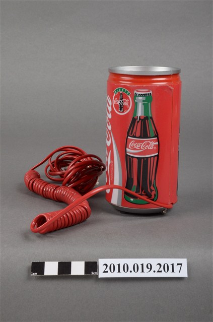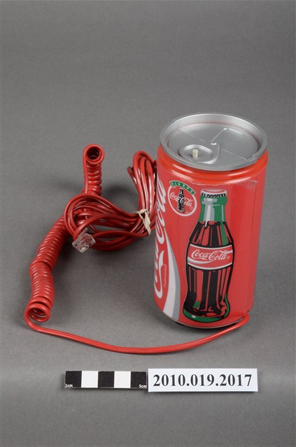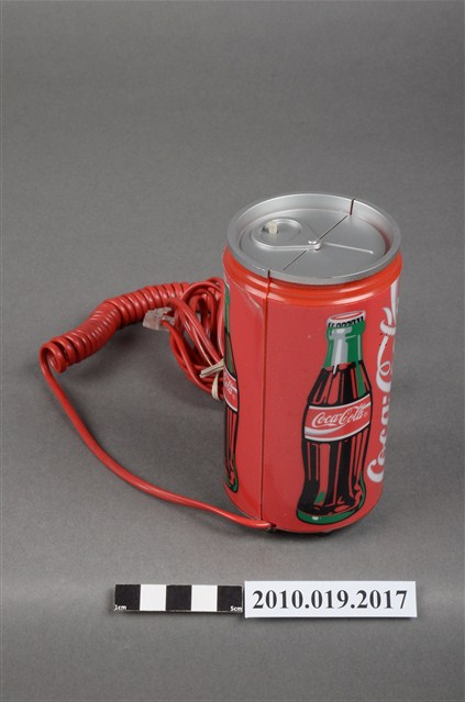 1.本物件為可口可樂造型電話筒,設計為紅色可口可樂的造型,瓶身上除了有白色Coca-Cola還有玻璃瓶裝的可口可樂圖案與商標,從罐子中央打開則為電話,上面有聽筒與撥號按鍵及黃色標籤紙編號「C004231」,另一邊則為話筒,罐子底部有電話線與通話連接線。