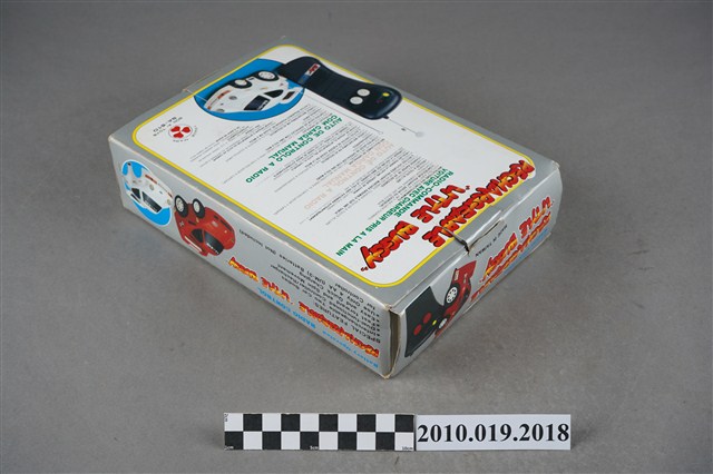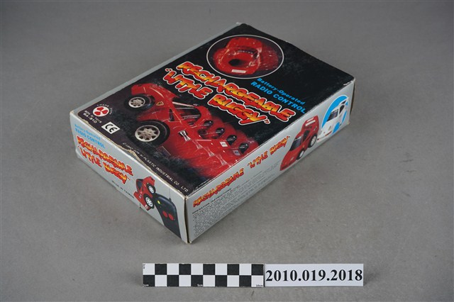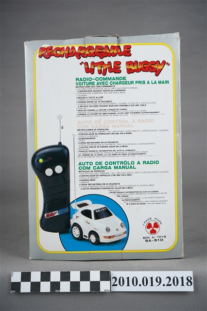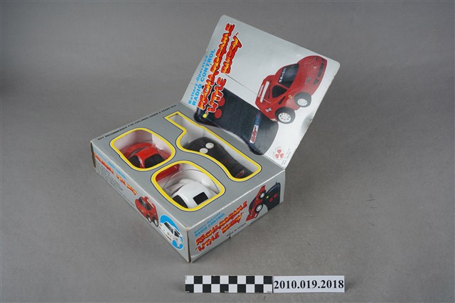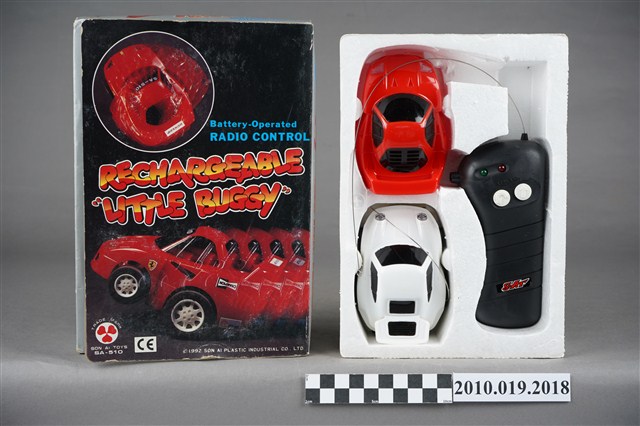 本物件為紅白遙控玩具車,主體放在紙盒內,車子顏色有紅色與白色,每輛車都有天線,附有黑色遙控器,遙控器上有2顆白色按鈕,盒子上面並寫「Battery-Operated RADIO CONTROL」與「RECHARGEABLE LITTLE BUGGY」,車子底部有商標及「SON AI TOYS」與「MADE IN TAIWAN」字樣。