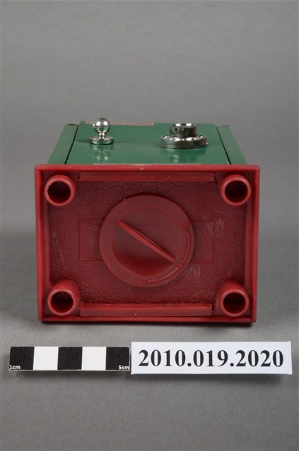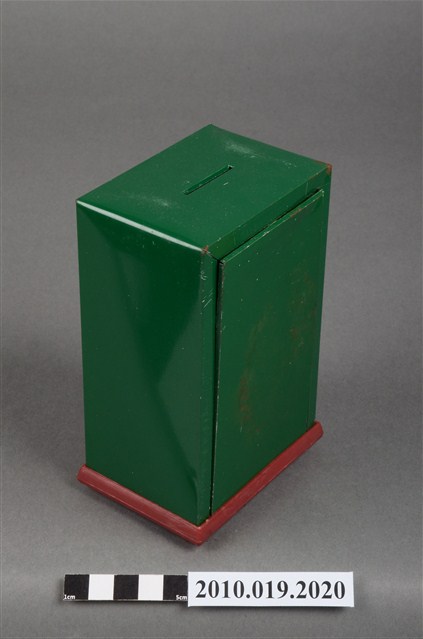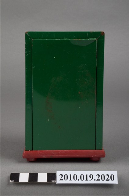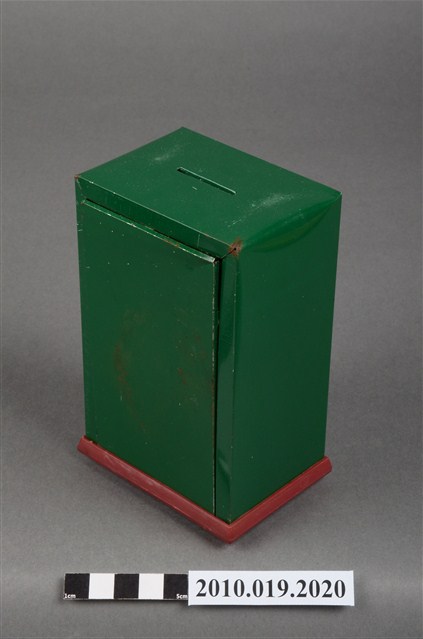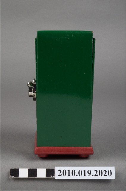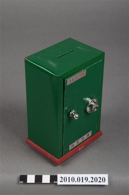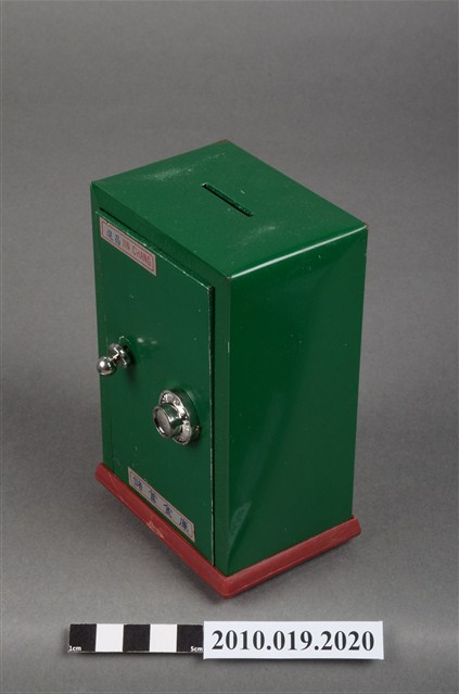 本物件為儲蓄金庫存錢筒,材質為金屬製,整體為綠色的立體四邊形造型。正面有一個銀色保險箱數字旋鈕及一個銀色圓形把手,上方印有「進昌JIN CHANG」字樣,下方印有「儲蓄金庫」字樣,頂部正中央有一長方形孔洞可投零錢。儲蓄箱連著一紅色塑膠底座,底部中心有一旋鈕印有「開」、「關」及指示方向,應為取出零錢處。