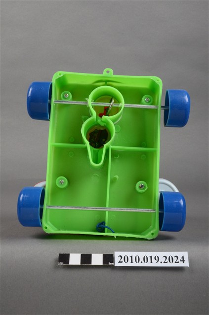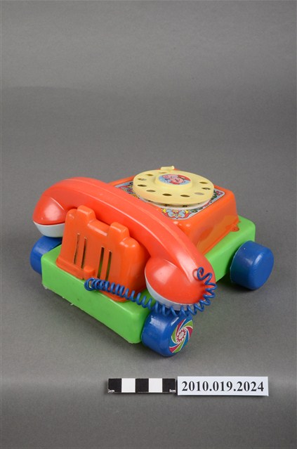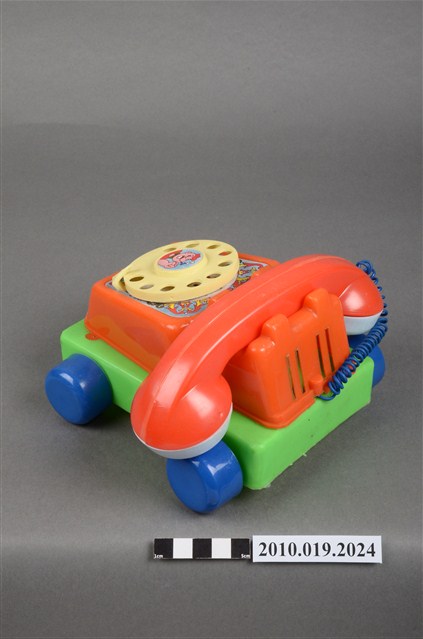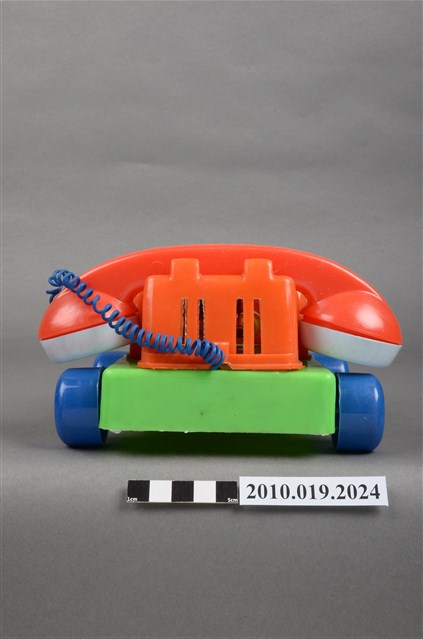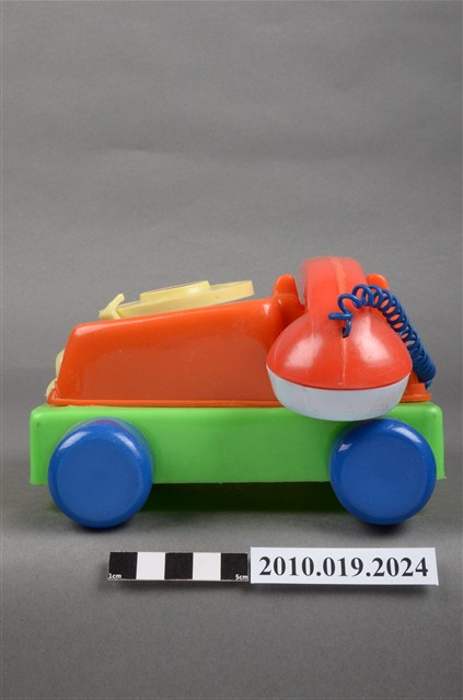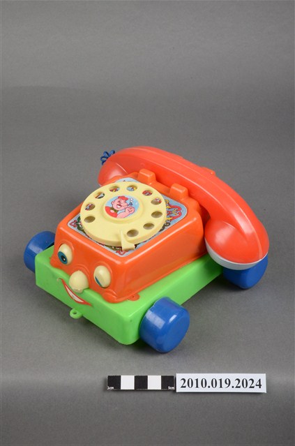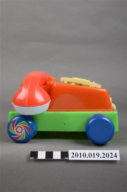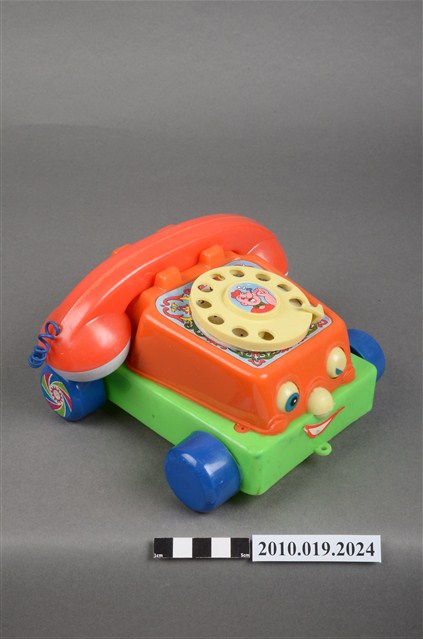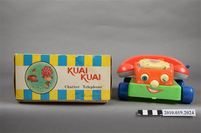 本物件為紅色電話車造型玩具,只有聽筒與話筒為白色,前方有2隻眼睛,右邊睜眼,左邊眼睛貼紙已經剝落,黃色的鼻子還有1張紅色微笑的嘴巴,電話線為藍色,電話上的撥號盤為黃色,整臺電話放在一個綠色平臺上,四個角落各有一顆藍色的輪子,旁邊有裝置的盒子,上面寫有「KUAI KUAI」、「Chatter Telephone」及「MADE IN TAIWAN」字樣。