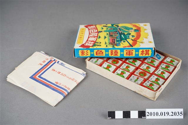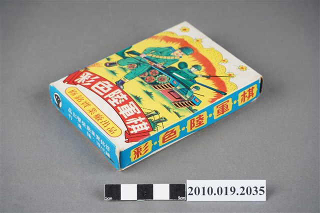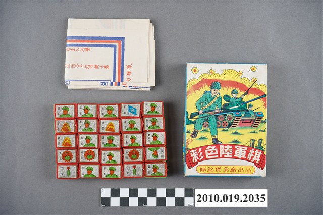 本物件為彩色陸軍棋,其外盒為畫有著軍服拿長槍與開坦克車的陸軍,上面寫著「彩色陸軍棋」字樣,盒子內裝有遊戲棋盤,長方紅色棋子25子,長方綠色棋子25子,兩位玩家各將代表棋子相背而立置放於兵站區及大本營區,軍旗限佈於大本營不得移動,地雷限佈於最後兩線不得移動,除工兵外可勝其他各子,各子走法照軍線每次限走一步,鐵道上最多可走三步,惟不得越過前停之子,凡子若走入行營中任何子不得向其攻擊,軍旗如被敵軍攻入奪去全軍即告失敗,其盒子外觀上寫有「修銘實業廠出品」。