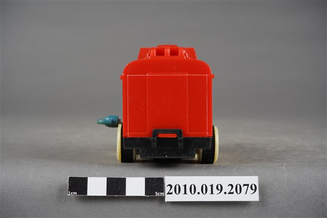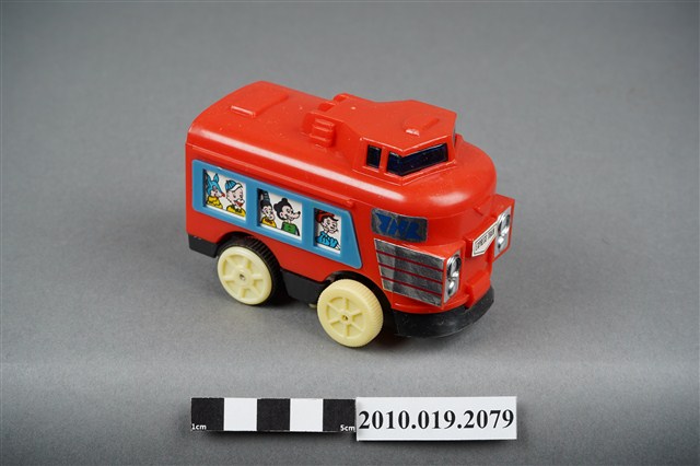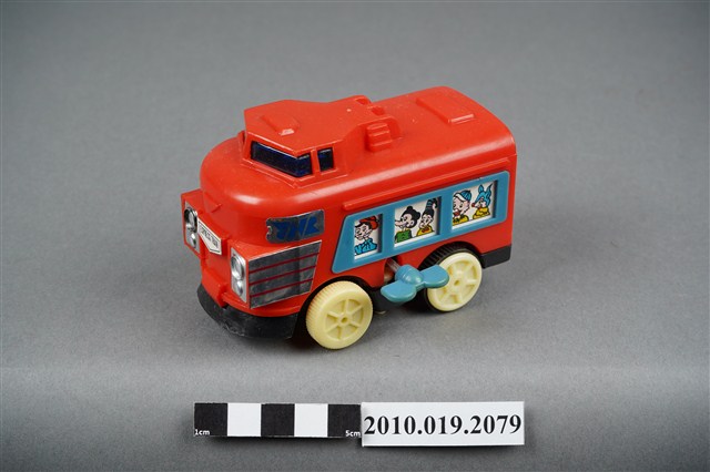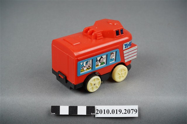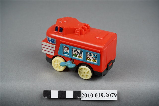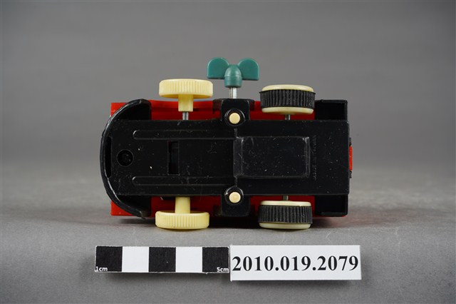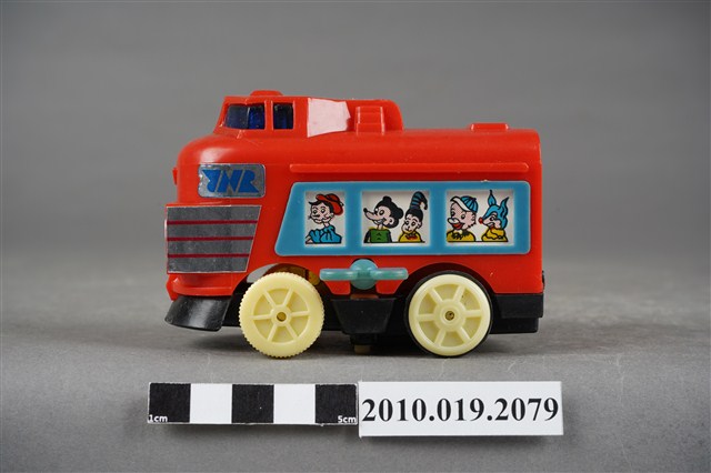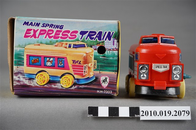 本物件為紅色玩具車,車頂窗戶為藍色,車身每邊都有3個藍色框架的窗戶,車頭有2顆圓形頭燈,車燈兩側為銀紅線條,車子正前方寫有白底黑字「EXPRESS TRAIN」,車輪為黃色,車子左側還有1根藍綠色發條鈕,可以使車子移動,車子底盤為黑色,印有「MADE IN TAIWAN」,整個車子有一個長方形包裝盒,盒子圖案與玩具車同款不同顏色,上面寫「MAIN SPRING EXPRESS TRAIN」,還標明商標、型號。