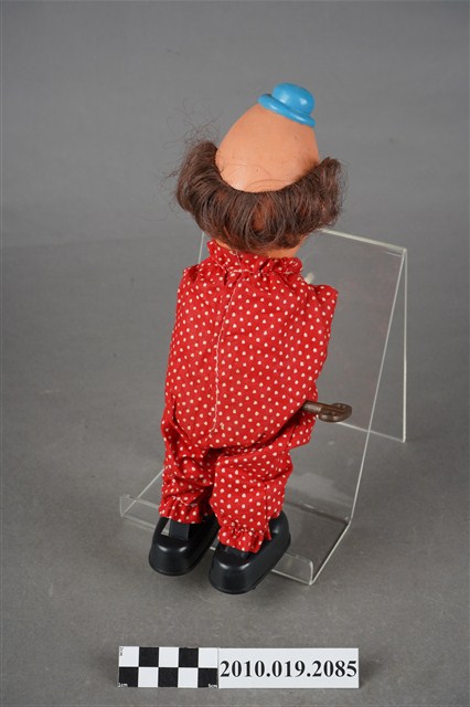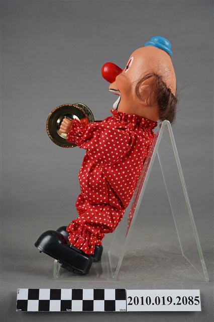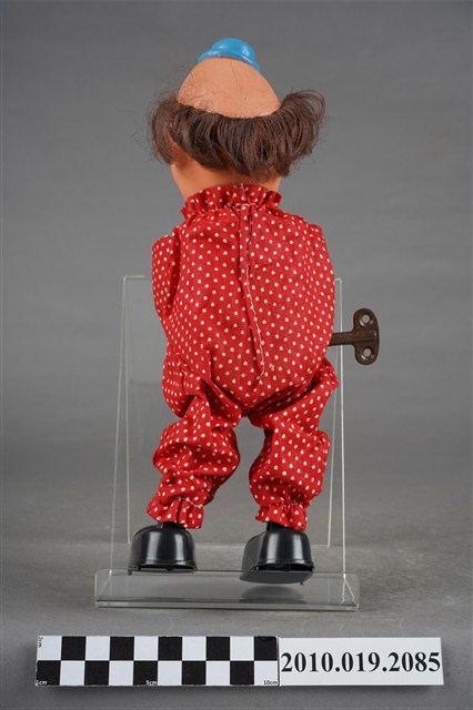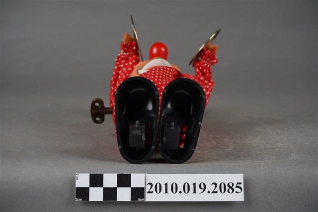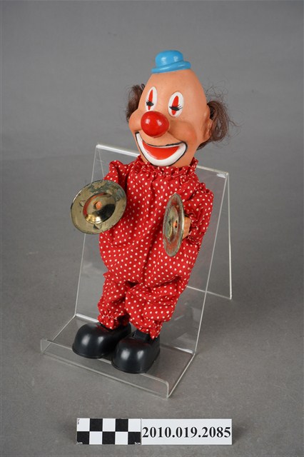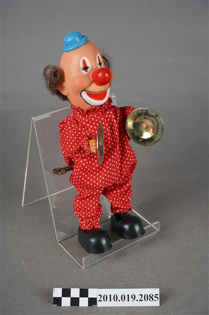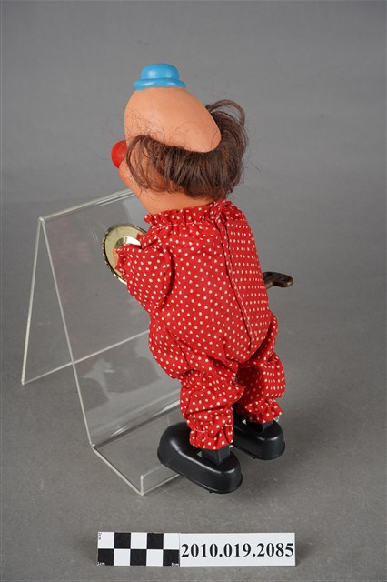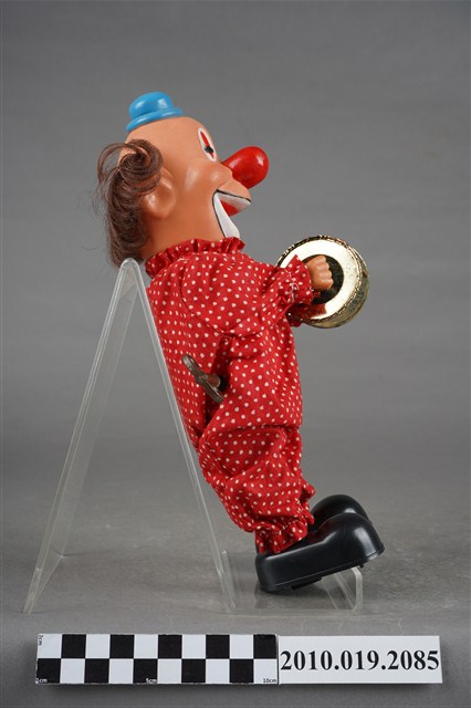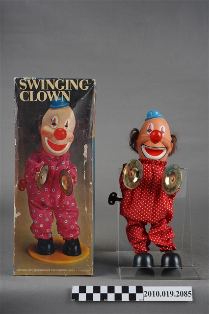 1.本物件為紅色塑膠製小丑玩偶,玩偶頭戴藍色小圓帽,頭頂無毛,後面及兩側有咖啡色捲髮,臉上畫小丑裝,戴紅色鼻子,身穿紅底白點的連身小丑服,腳穿黑色皮鞋,雙手拿著金色的鈸,玩偶的右側有一個咖啡色的發條鈕,可以轉動使小丑敲打鈸發出聲音,玩偶以一個長方形紙盒裝置,紙盒上方寫「SWINGING CLOWN」,主圖印有一個跟玩偶一模一樣的圖案。