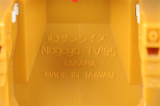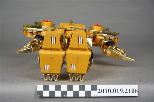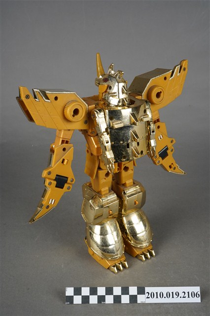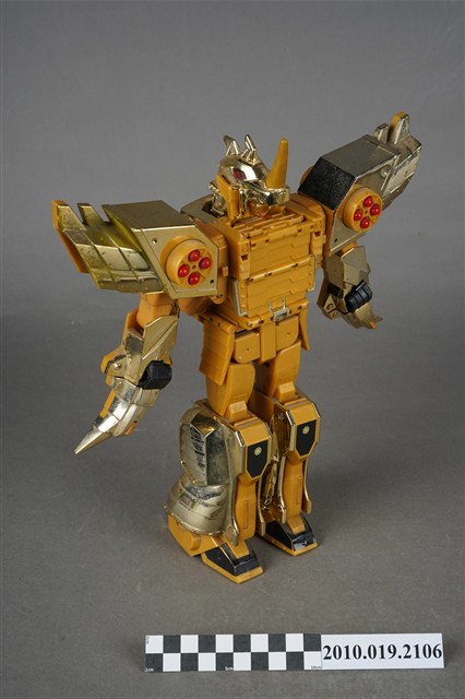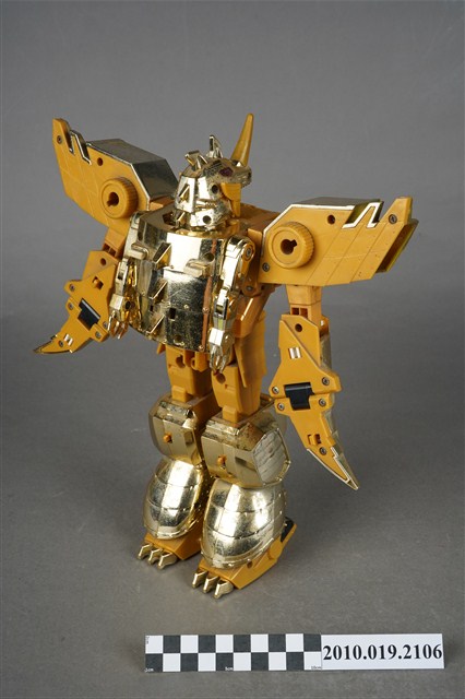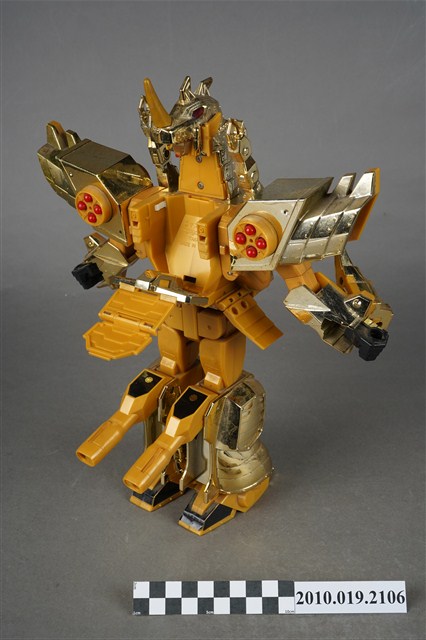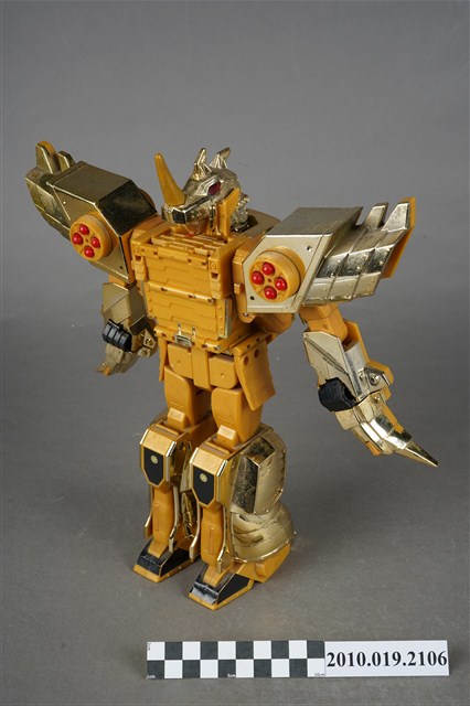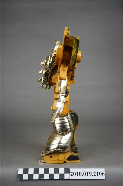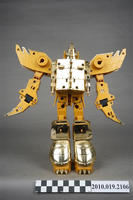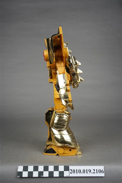 1.本物件為黃色機器人,為塑膠材質之可變形機器人,機器人主要由金色與黃色2種顏色構成,頭戴金色頭盔,穿鐵甲,後面揹一個金色背包,雙臂戴金色盔甲,肩膀前方各有1組圓形發射器,裡面有4顆紅色圓形子彈,除了肩膀,機器人的手、腳都可以當成發射器,發射武器攻擊,機器人的頭部、手部與腳都是可以活動的可以變換造型,機器人身上並寫有「Nagoga TV’95」、「TAKARA」與「MADE IN TAIWAN」字樣。