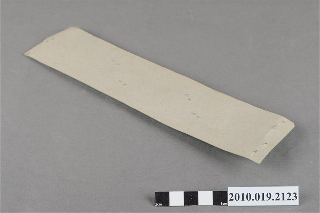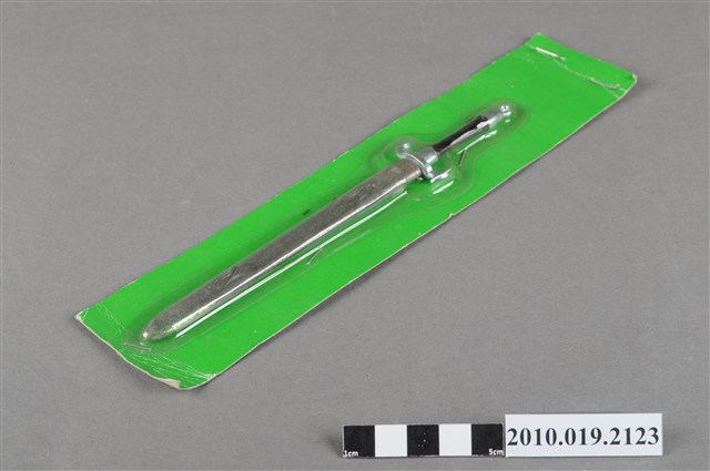 本物件為銀色塑膠玩具劍,分為刀鞘與刀體本身2個組合,劍鞘為銀色,劍柄則為黑色,刀子收於刀鞘內,整把劍以透明塑膠膜黏貼於綠色紙板上。