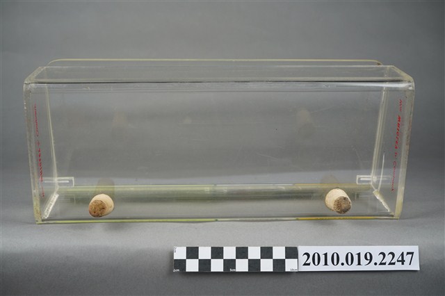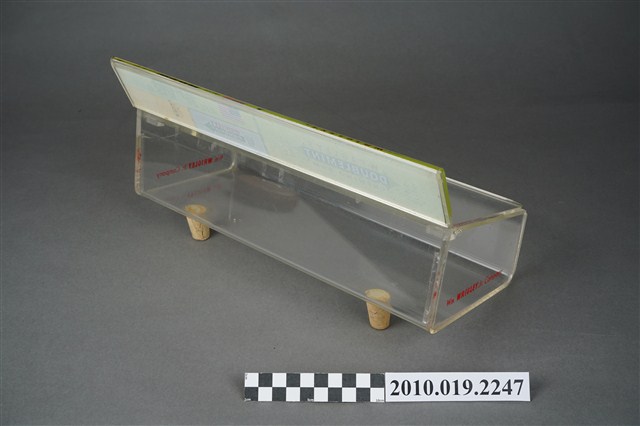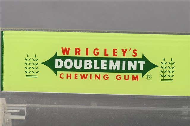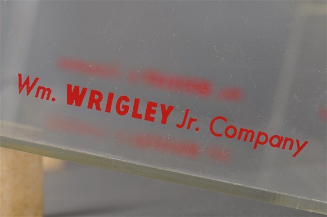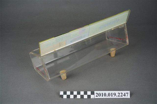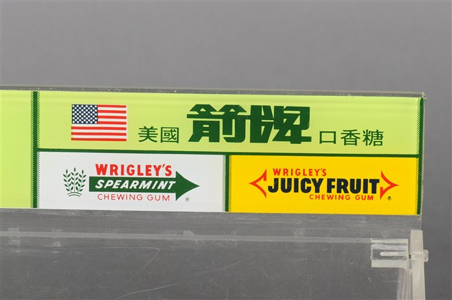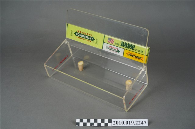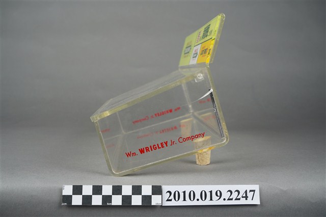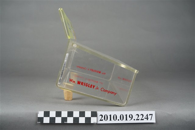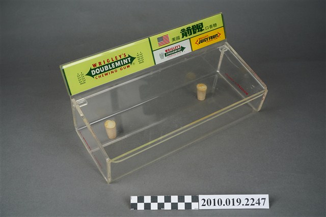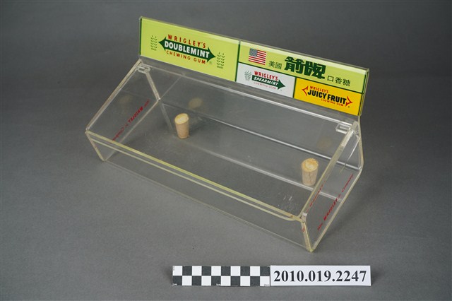 1. 本件為販售美國箭牌口香糖的專用盒,整體壓克力材質,有標示立牌,活動式掀蓋,盒身部分前低後高,盒底黏有兩個軟木塞,以增加盒身高度與視覺效果。2. 販售盒立牌部分左半邊為箭牌口香糖中的雙倍薄荷口味的青箭口香糖標誌,中間為一個雙箭頭,指向兩邊的薄荷葉圖案,箭頭桿中間為白色「DOUBLEMINT」字樣,上下則分別是紅色「WRIGLEY'S」、「CHEWING GUM」字樣。立牌右側上方為美國國旗圖樣與綠色「美國箭牌口香糖」字樣。立牌右側左下方為清淡薄荷口味的白箭口香糖標誌,中間為一個向右指的單箭頭,箭頭號端為薄荷葉圖案,箭頭桿中間為白色「SPEARMINT」字樣,上下則分別是紅色「WRIGLEY'S」、「CHEWING GUM」字樣。立牌右側右下方為水果口味的黃箭口香糖標誌,中間為一個無箭桿的雙箭頭,黑色「SPEARMINT」字樣,上下則分別是紅色「WRIGLEY'S」、「CHEWING GUM」字樣。合身兩側底端皆有紅色「Wm. Wrigley Jr. Company」字樣。因年代略久,盒身上有多道刮痕以及有側一處裂痕。3. 箭牌口香糖是由美國人William Wrigley於1893年創辦生產,日治時期有代理商從日本引進,到了1970年代才有在臺正式代理。此類的販售盒往往被設置在櫃檯收銀機旁,好讓顧客在結帳前順便多帶一條,或是用找零的錢換購,藉此刺激銷售量。壓克力透明盒身的設計,使得產品的樣貌可以完全展露,達到商品即廣告的效果。