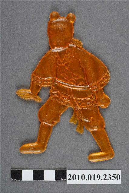 1.本物件為漫畫諸葛四郎之諸葛四郎尪仔仙。硬質塑膠材質,扁平,單一橙色,雙面浮雕圖案。正面圖案為綁著兩個髮髻的諸葛四郎,其服裝為左襟壓右襟之右衽形式,腰間有綁帶,其略微彎腰,雙腳跨開為站姿。
