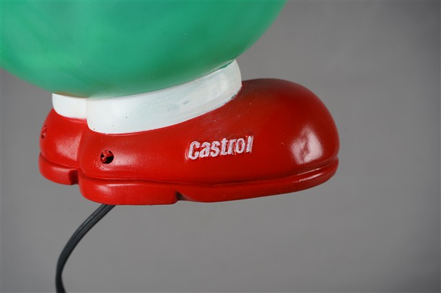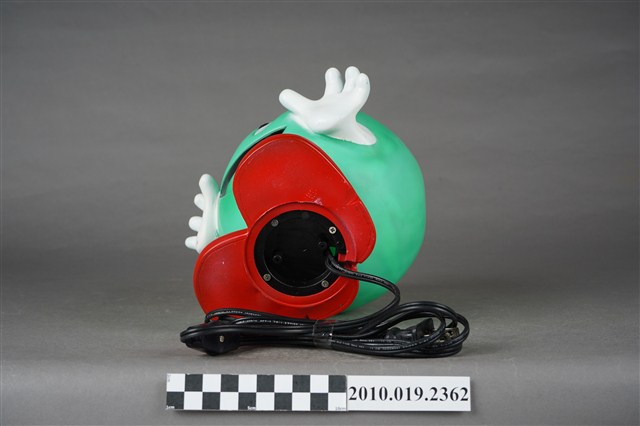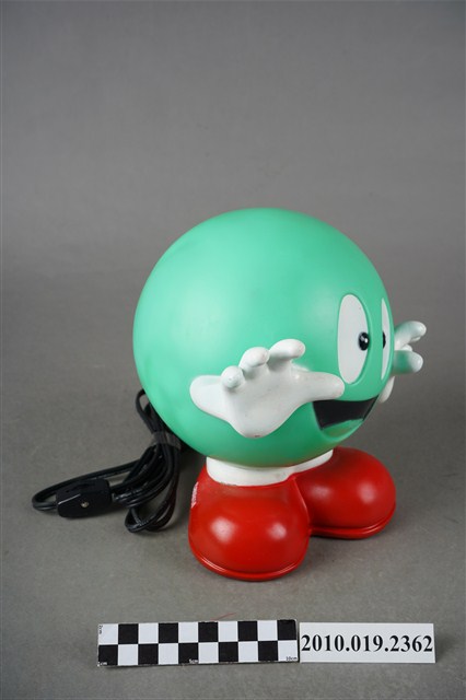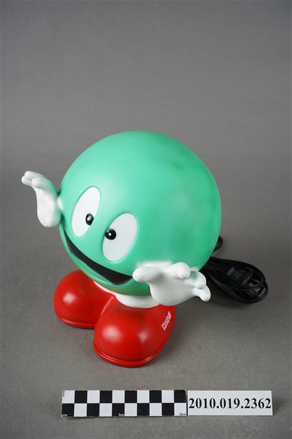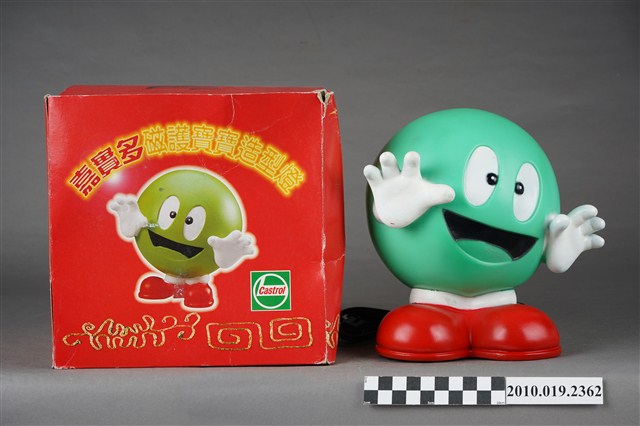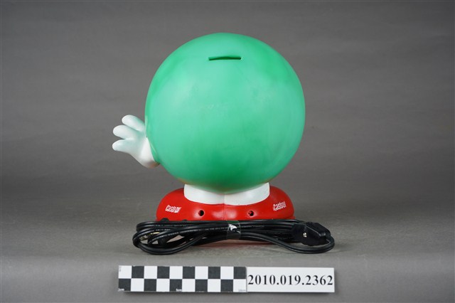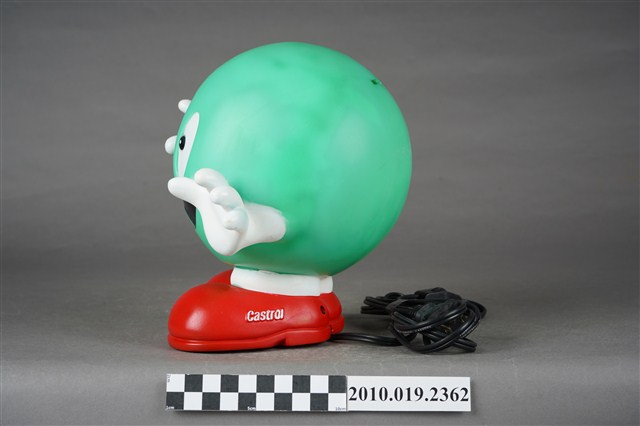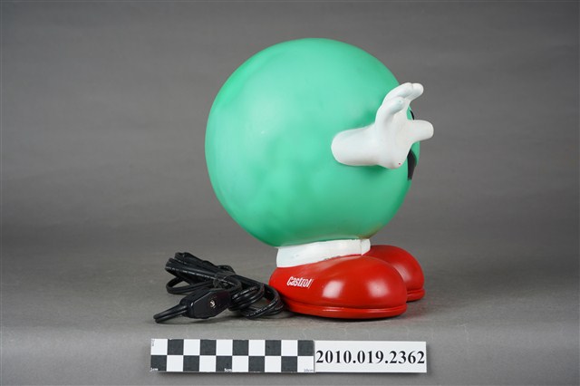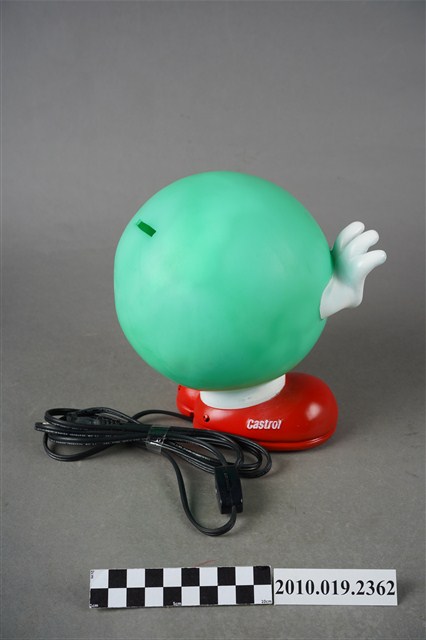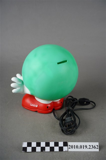 1.本件嘉實多磁護寶寶造型燈通身以塑膠製作,其造型為擬人化的商品吉祥物,呈圓球型綠色身體,正面帶有面部表情,以及白色雙手,下端腳部穿著紅鞋,側面印有白字「Castrol」。本件造型燈原本設計作燈飾使用,於腳後跟處帶有電線插頭以及開關裝置。背面頂端處設計有橫式長方形開口,內部中空,只要於腳底處更換存錢筒專用底蓋,即可作存錢筒使用。