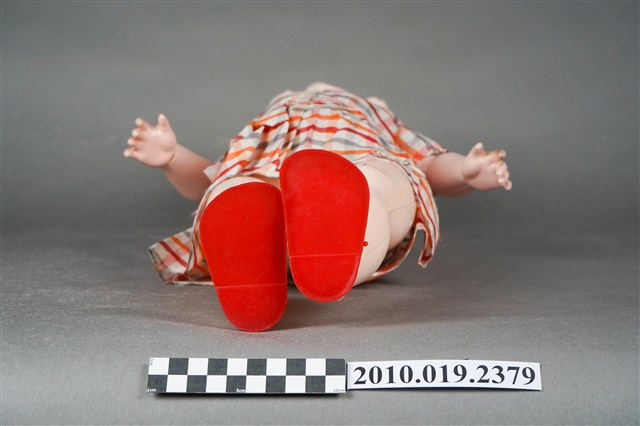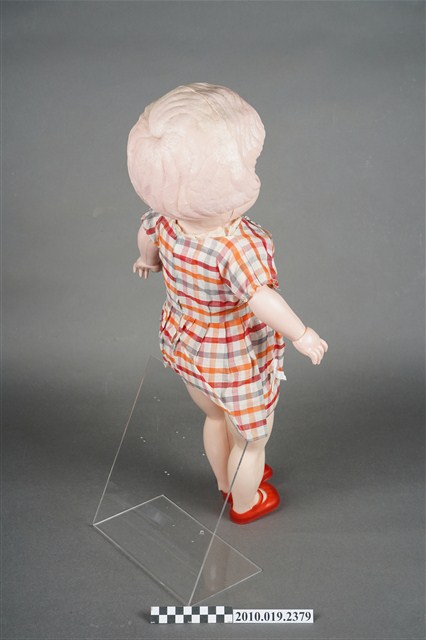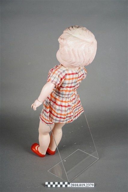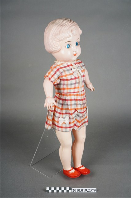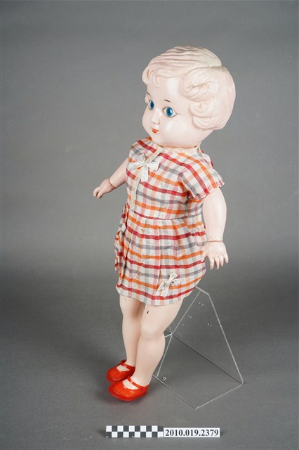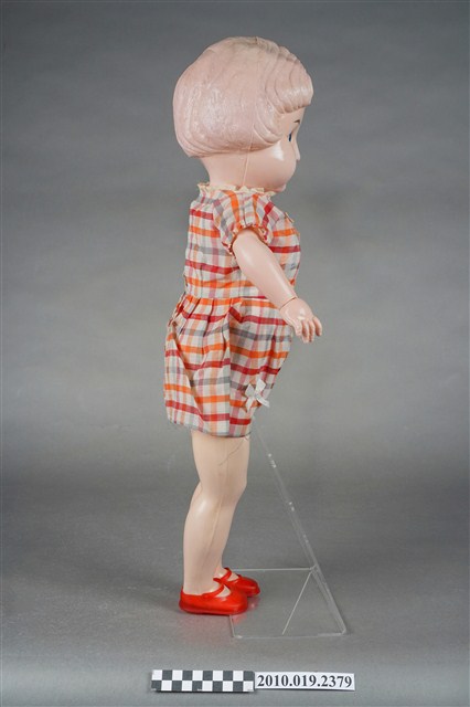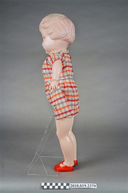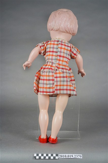 本物件為格子洋裝女孩玩偶,女孩呈現站姿。頭髮為短捲髮,眼睛為藍色,嘴巴塗有口紅,身著黃色、橘色、灰色線條相交之格子連身洋裝,腳上穿有塑膠紅鞋。