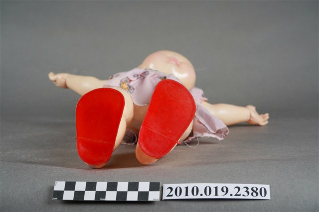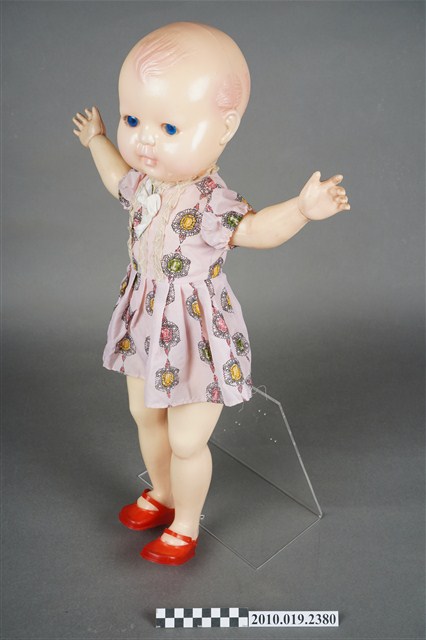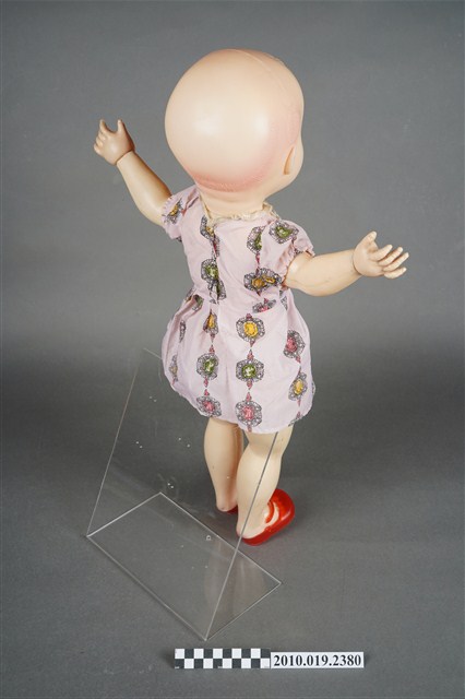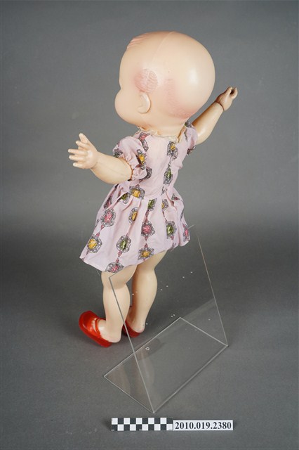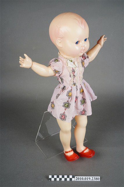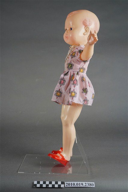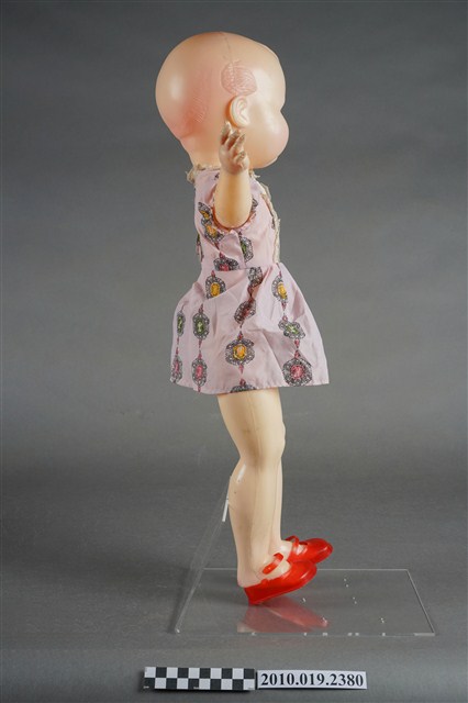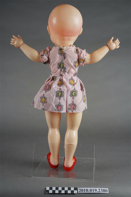 本物件為粉色印花洋裝女孩玩偶,女孩呈現站姿。頭髮為短捲髮,眼睛為藍色,嘴巴塗有口紅,雙手張開,身著粉色洋裝,洋裝上方印有寶石圖樣印花,領口處縫有蕾絲,腳穿塑膠紅鞋。