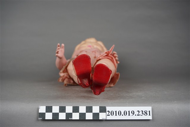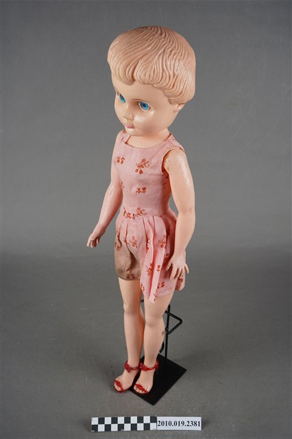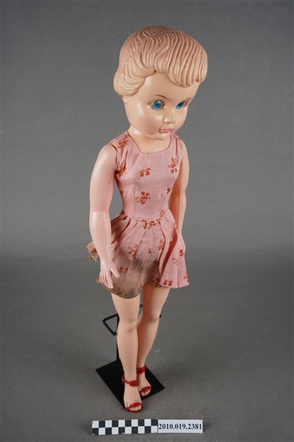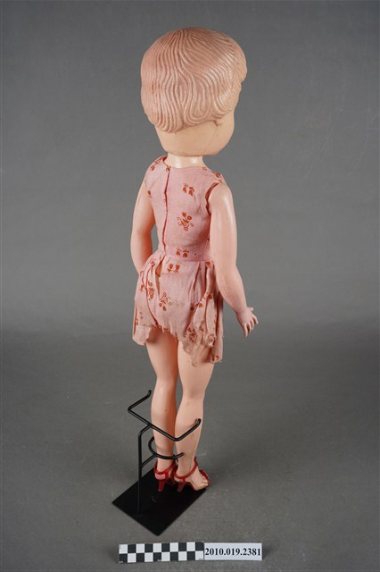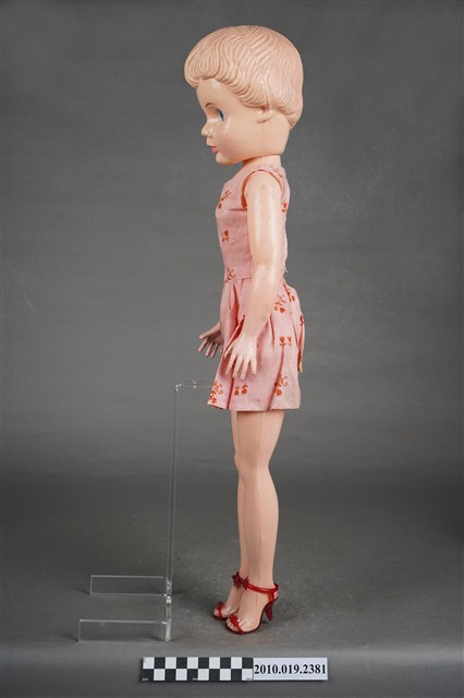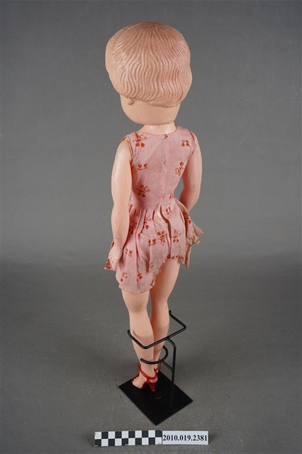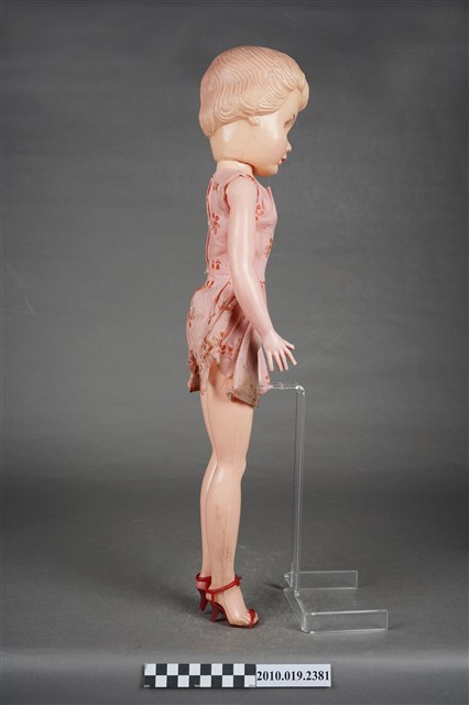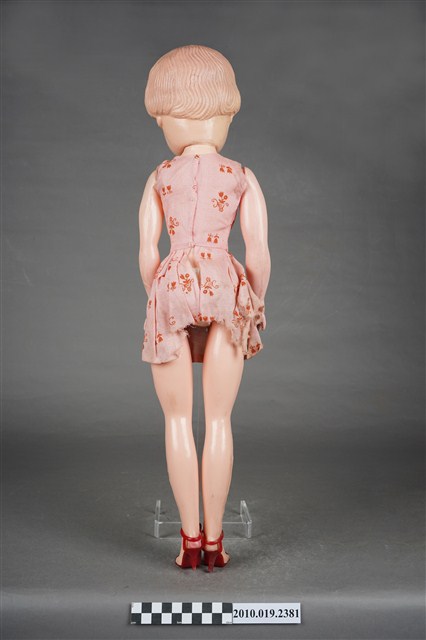 本物件為粉色洋裝女孩玩偶,女孩呈現站姿。頭髮為短捲髮,眼睛為藍色,嘴巴塗有口紅,雙手垂放於左右兩側,身著粉色洋裝,洋裝上方印有紅色花朵圖樣印花,腳穿紅色塑膠涼鞋。
