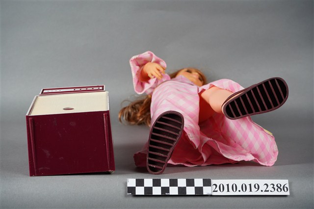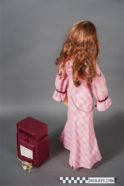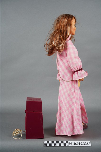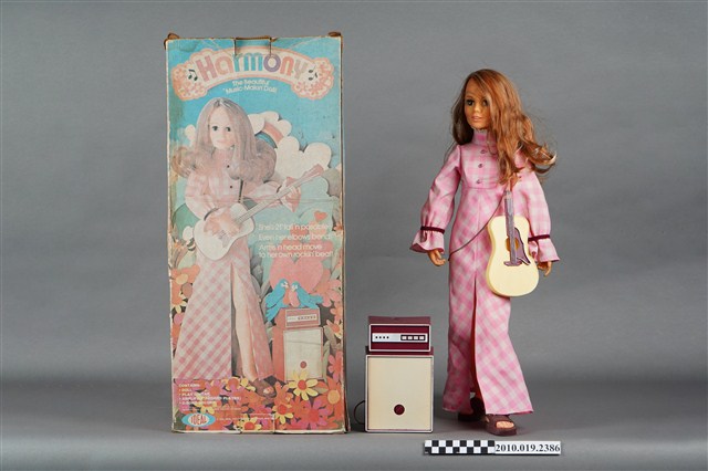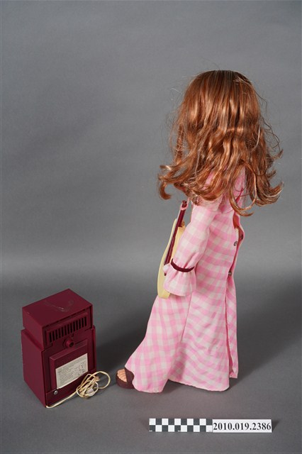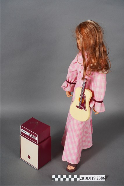 本物件為和諧音樂娃娃,材質為塑膠與布料,整體呈現為揹吉他站立的造型並搭配一台獨立擴音器。娃娃有一頭棕色微捲過肩長髮,臉部長相秀氣,有雙長睫毛大眼,稍微露齒微笑,身穿粉紅格子高領長袖且長度及腳踝的長洋裝,手肘可彎曲,揹著一把米色吉他,腳踩酒紅色涼鞋,鞋底有「IDEAL」廠商logo及「5491 02 R1」編碼。擴音器為立體方型,顏色為酒紅色但正面為米色,背面的掀蓋有「©1972 IDEAL TOY CORP. U.S. PAT. NO.3,411,790」字樣,掀蓋還貼著一張白色說明「Always store with record in and batteries removed. Do not put pressure on loud speaker.」以及錄音轉盤調整注意事項,擴音器下方有條白色電線。