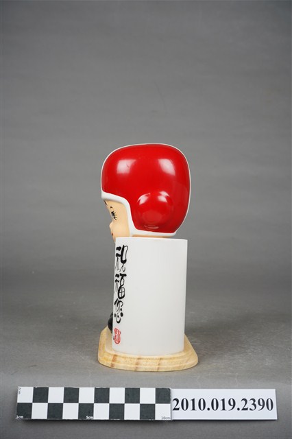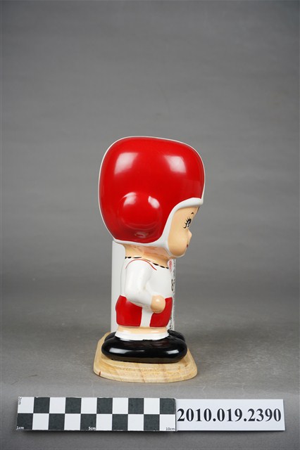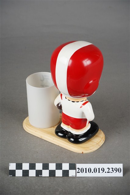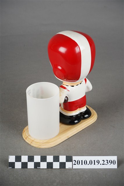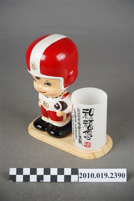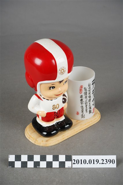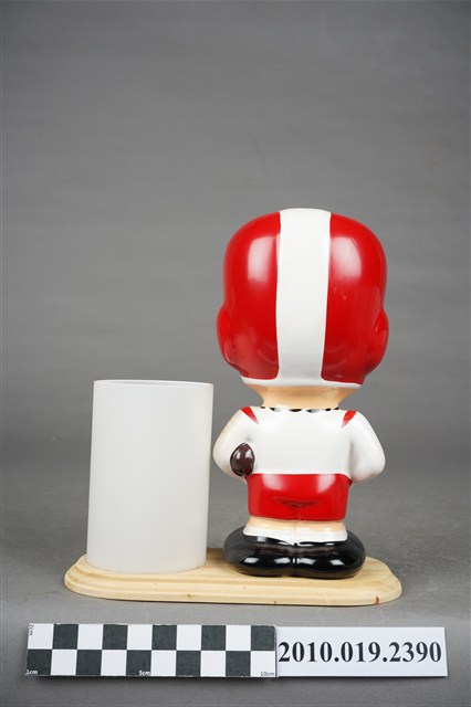 1.本物件為80號大同寶寶筆筒,塑膠製大同寶寶,細眉大眼,張嘴微笑,頭戴紅白相間頭盔,頭盔上有紅色圓形大同公司商標,左手持橄欖球、身著白色球衣,球衣上寫有「80」字眼,下半身著紅色球褲,腳上穿黑色鞋子,站立於原色木板上,旁邊有白色筆筒,外面寫有「祝福您」等祝福語句。