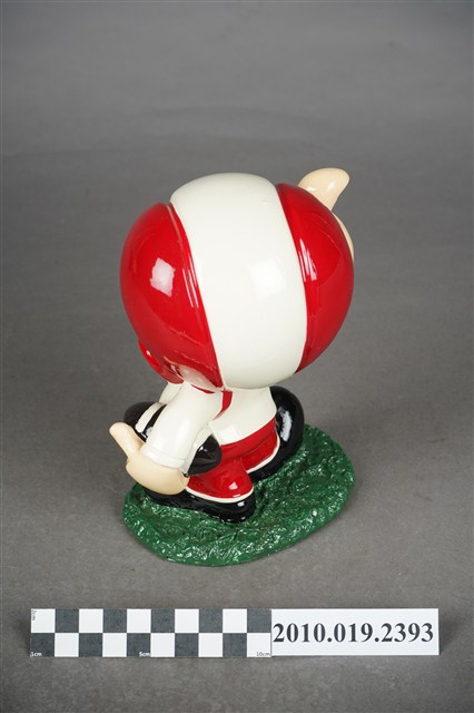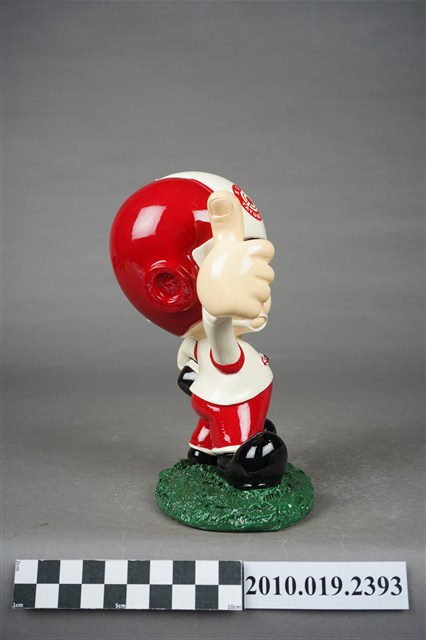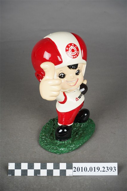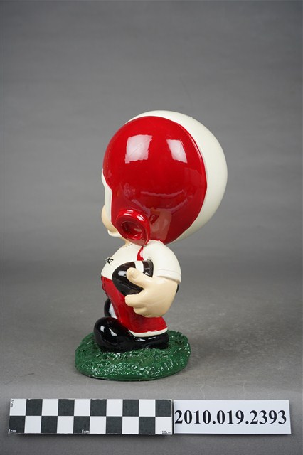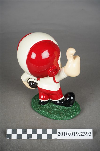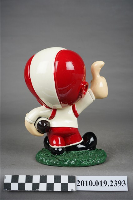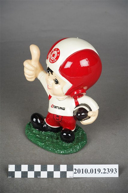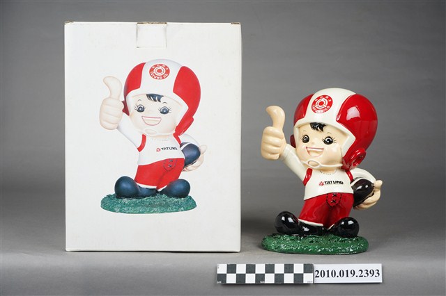 1.本物件為大同寶寶玩偶,塑膠製大同寶寶,細眉大眼,張嘴微笑,頭戴紅白相間頭盔,頭盔上有紅色圓形大同公司商標,左手持橄欖球、右手向上大拇指比讚,身著白色球衣,球衣上寫有「TATUNG」字眼,下半身著紅色球褲,腳上穿黑色鞋子,腳踩在綠色草皮上,整個物件保存良好,乾淨鮮明。