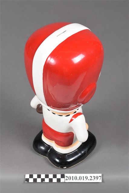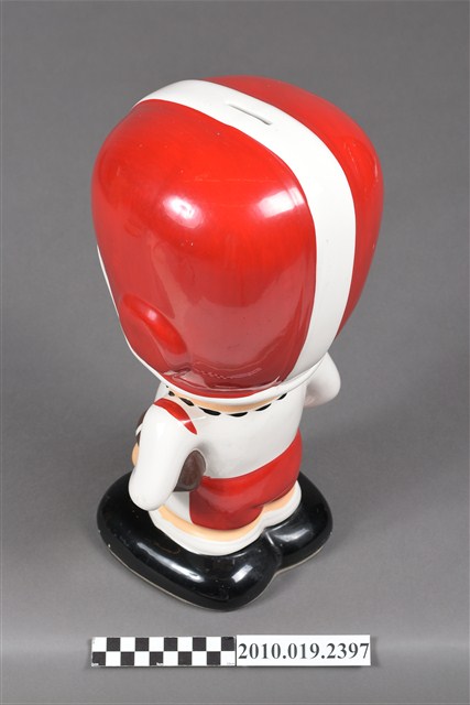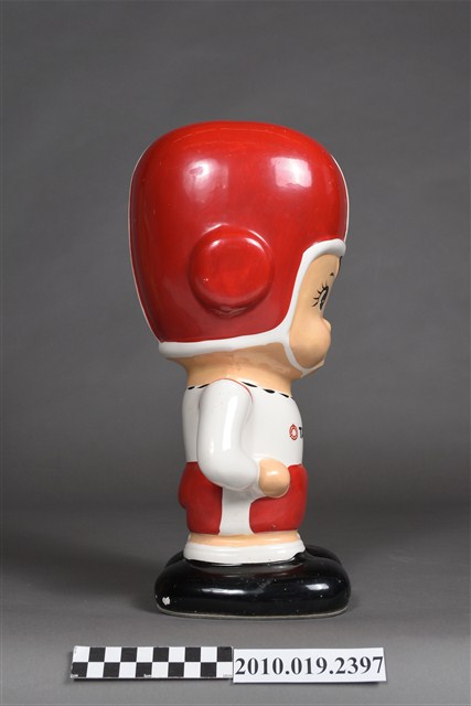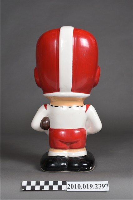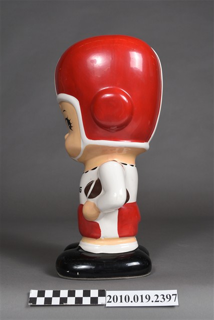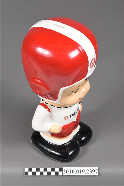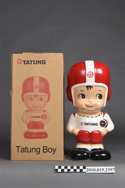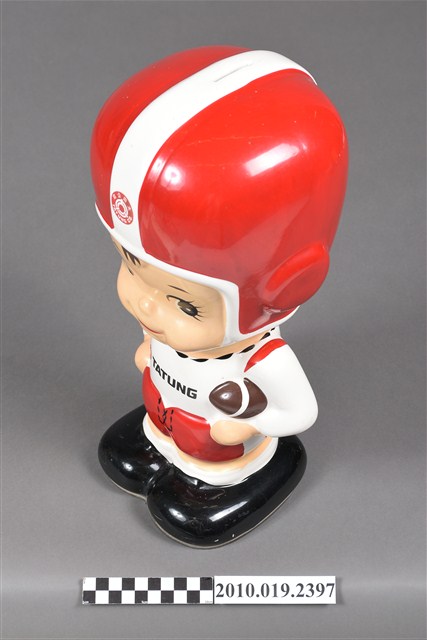 1. 本物件為陶瓷製大同寶寶玩偶存錢筒,頭上戴著紅白相間的頭盔,印著「大同公司」、「TATUNG CO」等文字和圖案組成的標章,左手抱著橄欖球,右手插腰,運動服裝前面也有黑色「TATUNG」的字樣,服裝背面則為無邊號。該文物附有一收藏紙盒,紙盒上印有「Tatung Boy」之字。