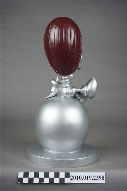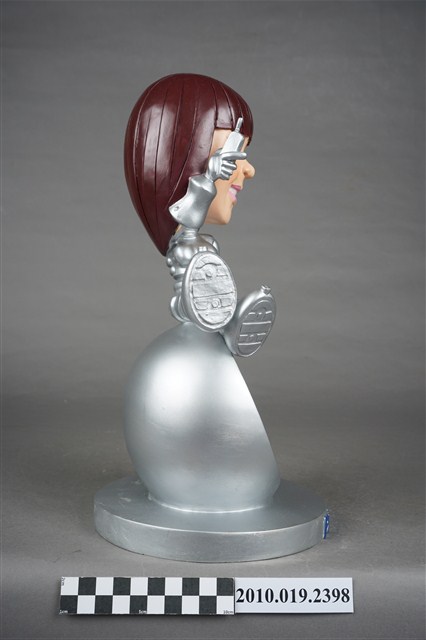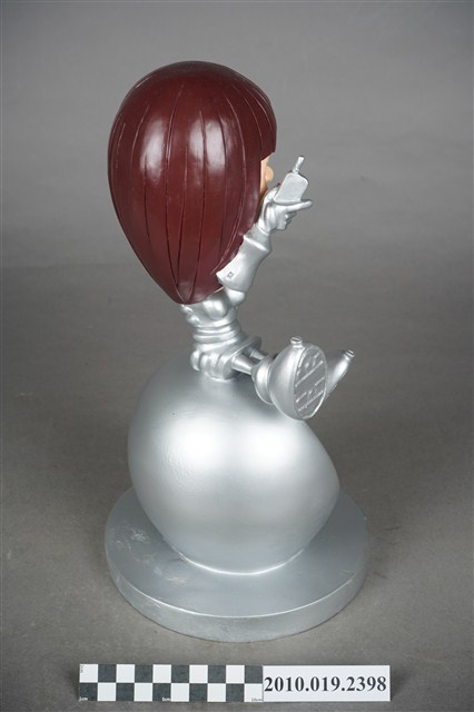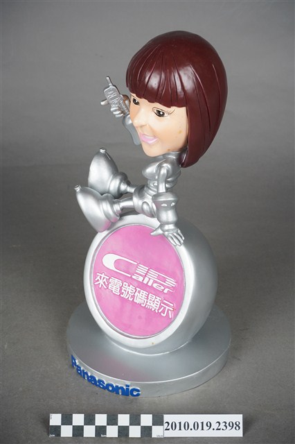 1.本物件為臺灣松下川島茉樹代造型擺飾,玩偶留中長髮的妹妹頭,身著銀色連身衣褲,腳著銀色鞋子,右手持一支手機,坐於半面球體上,球體正面為粉紅色,上面寫有「來電號碼顯示」,底座亦為銀色,前方寫有「Panasonic」,整個物件保存良好,鮮明乾淨。川島茉樹代為臺灣著名藝人,出身日本神奈川,為從日本來臺發展的藝人。