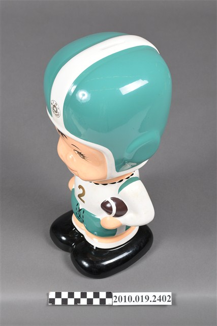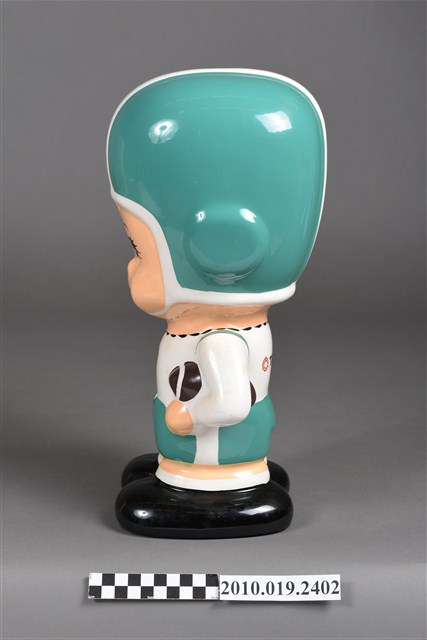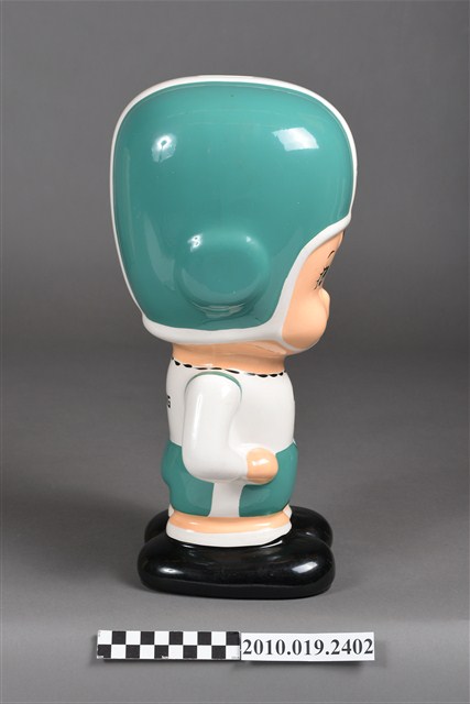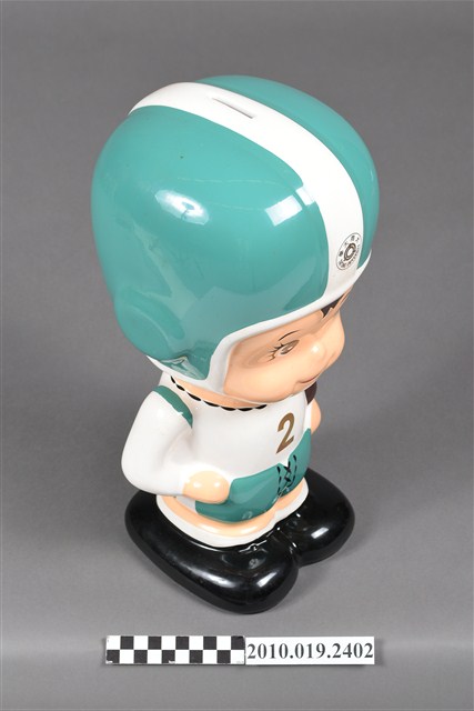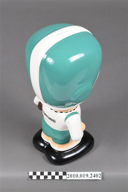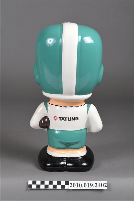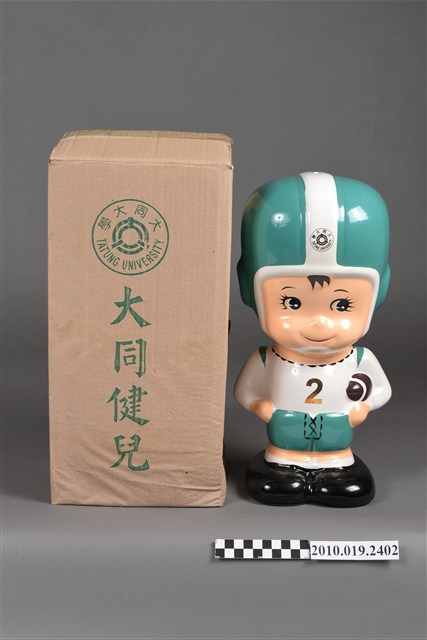 1. 本物件為陶瓷製2號大同大學寶寶存錢筒,頭上戴著藍綠色與白色相間的頭盔,印著「大同大學」、「TATUNG UNIVERSITY」等文字和圖案組成的標章,左手抱著橄欖球,右手插腰,運動服裝前面也有金色「2」的字樣,服裝背面則為「TATUNG 」。該文物附有一收藏紙盒,紙盒上印有「大同大學」、「大同健兒」之字。