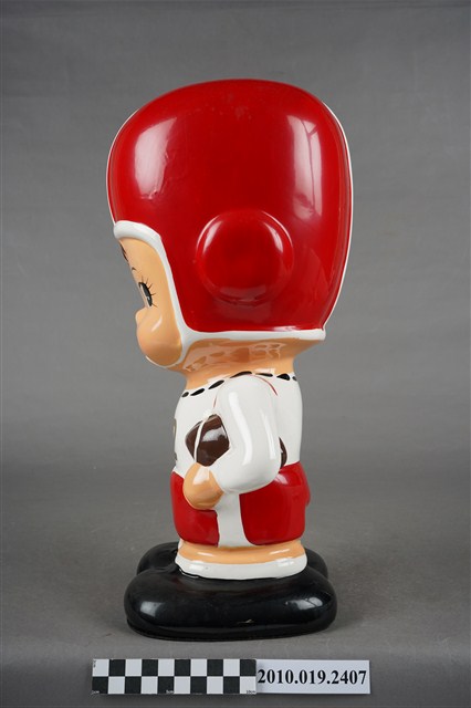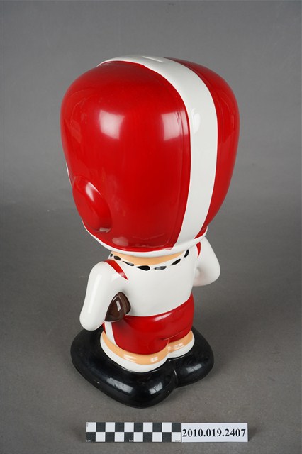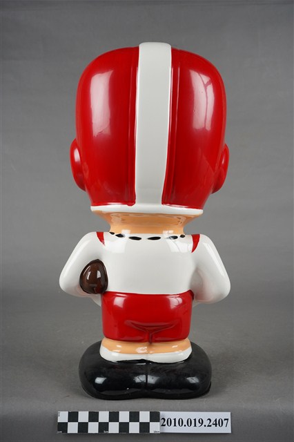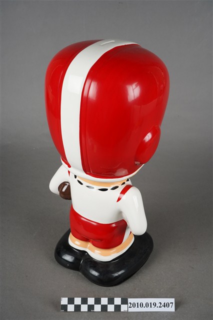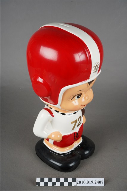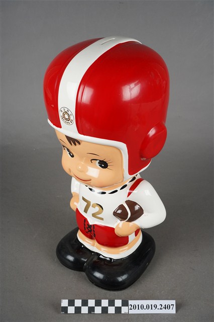 1. 本物件為陶瓷製72號大同寶寶存錢筒,頭上戴著紅白相間的頭盔,印著「大同公司」、「TATUNG CO」等文字和圖案組成的標章,左手抱著橄欖球,右手插腰,運動服裝前面也有黑色「72」的字樣,服裝背面則為無邊號。