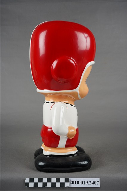 2. 大同寶寶是大同公司的企業娃娃,大同公司原為由林尚志與其合夥人共同創立於1918年的協志商號,當時以營造業為主。1939年林尚志成立大同鐵工所,戰後改為大同製鋼機械公司,1968年改名為大同股份有限公司。1969年(民國58年)大同製鋼機械公司為紀念51年廠慶,製造第一隻大同寶寶,其編號為51,往後每年皆會生產一隻大同寶寶,上面編號即為創廠紀念號。當時很多消費者將大同寶寶當作消費禮物或者電視、冰箱上的裝飾品。其中,原本編號為74號至79號,也就是1992年至1997年的大同寶寶僅有胸前的企業商標,背後並無編號。本文物應為1990年製造。