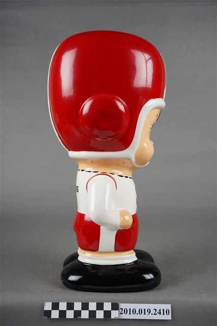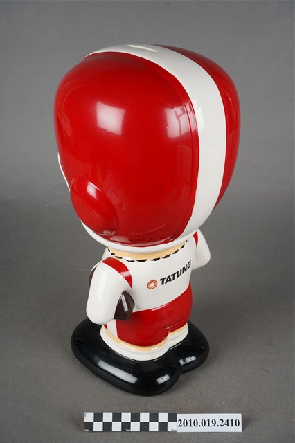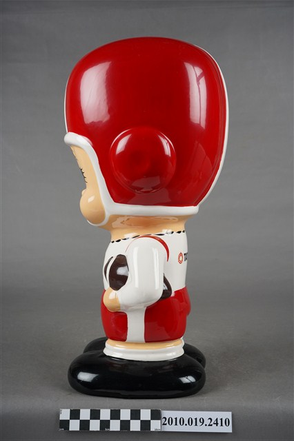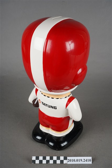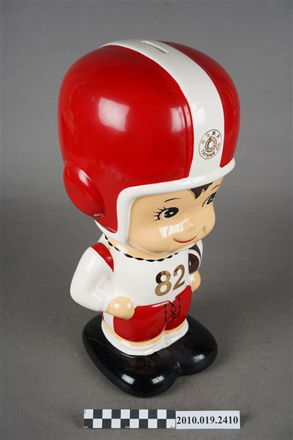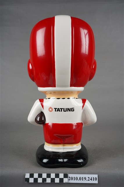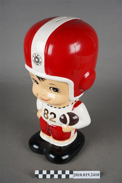 1. 本物件為陶瓷製82號大同寶寶存錢筒,頭上戴著紅白相間的頭盔,印著「大同公司」、「TATUNG CO」等文字和圖案組成的標章,左手抱著橄欖球,右手插腰,運動服裝前面也有黑色「82」的字樣,服裝背面則為「TATUNG」。