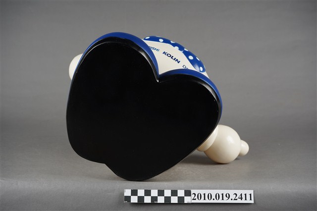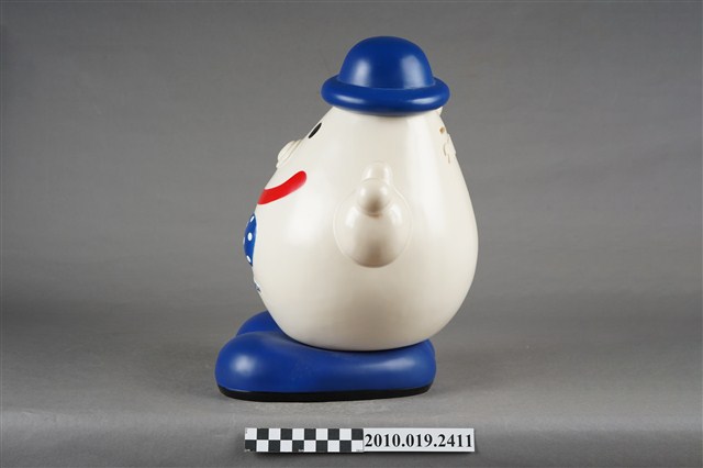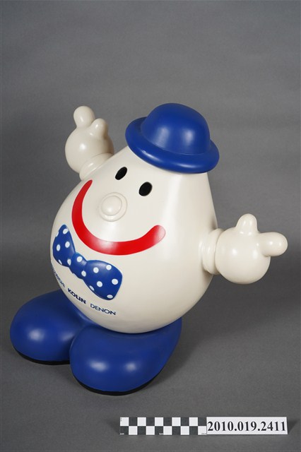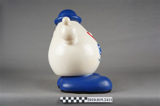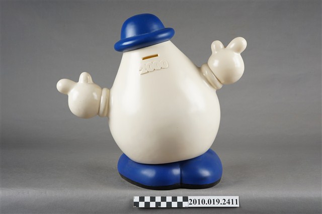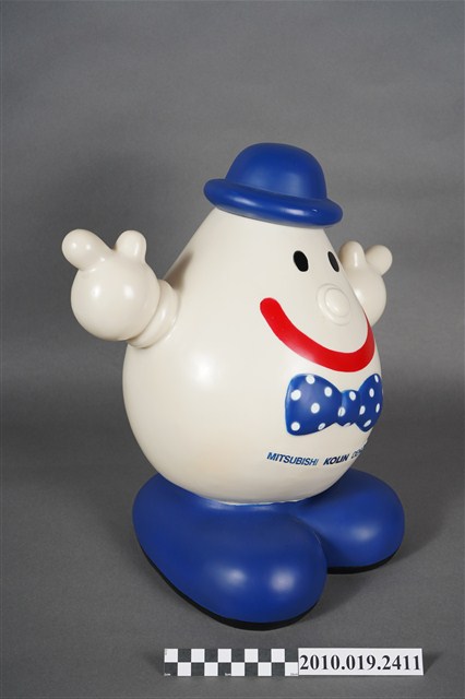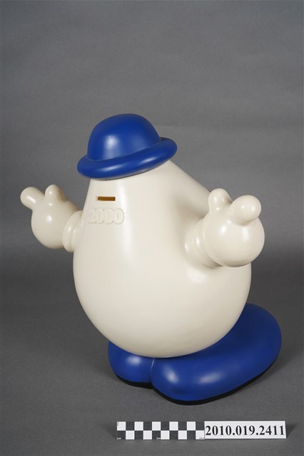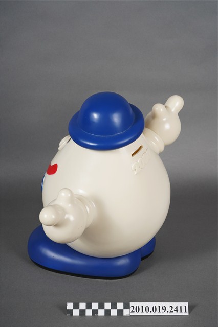 1.本物件為歌林水滴寶寶存錢筒,為塑膠材質,主體為白色,頭戴藍色圓帽,兩顆圓形黑眼睛,圓鼻子,紅色嘴巴咧大微笑,胸前別一個藍底白點的蝴蝶結,下方並寫有「MISUBISHI KOLIN DENON」,雙手高舉,腳著藍色鞋子,背面有1細長方形開口,可以投入錢幣,下方並有數字「2000」。