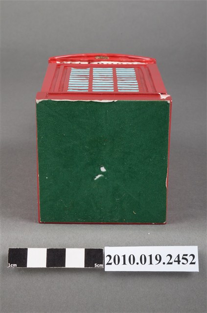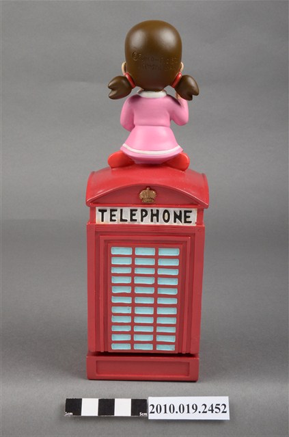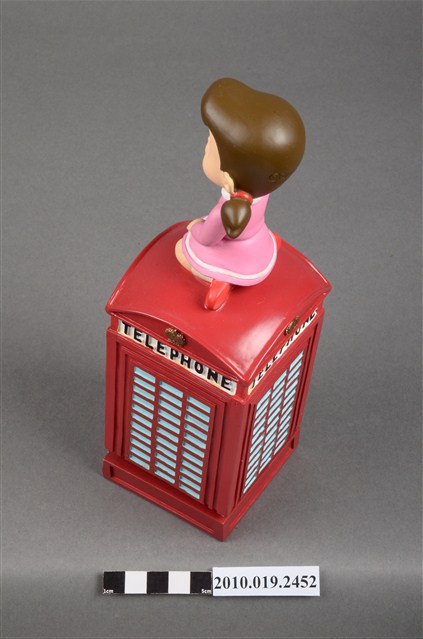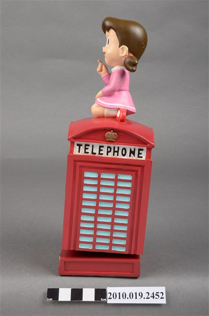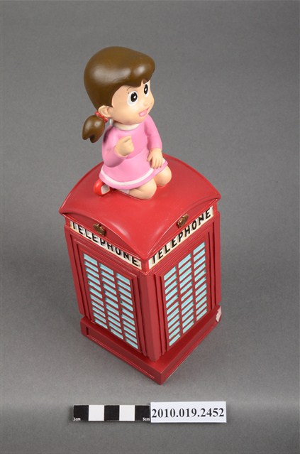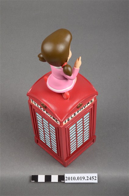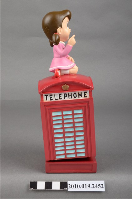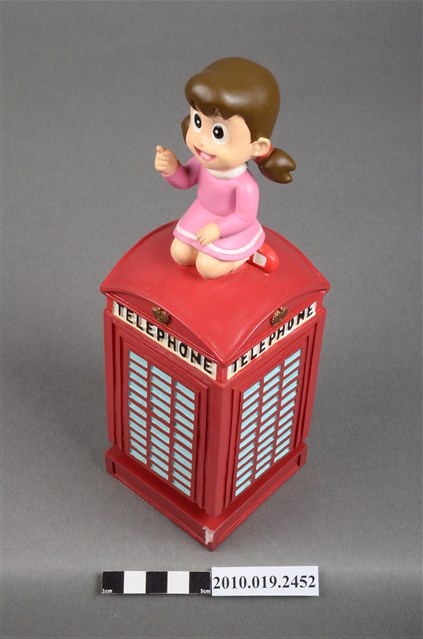 1.本物件為靜香電話亭造型音樂盒,其外觀為紅色長方形電話亭,頂端坐著靜香,頭髮綁馬尾,大眼張嘴微笑,身著粉紅色滾白邊洋裝,腳著白短襪與紅色鞋子,左手置於膝上,右手則高舉向前比,以跪姿席地而坐,電話亭上方的四周皆有白色標籤寫上「TELEPHONE」,底座為綠色防滑布,整個物件僅有些許斑駁。
