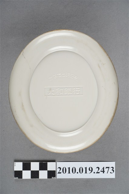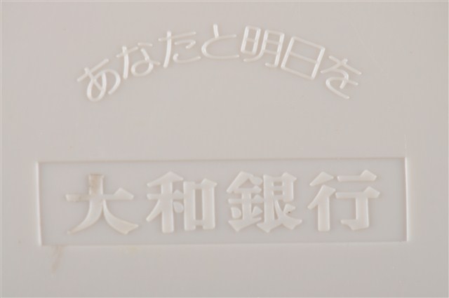 1.本物件為大和銀行草帽存錢筒,整體為草帽搭配紅色絲帶的造型,上方有投幣孔。底部為有設計將錢幣取出之圓形口,寫有「あなたと明日を」、「大和銀行」的字樣。