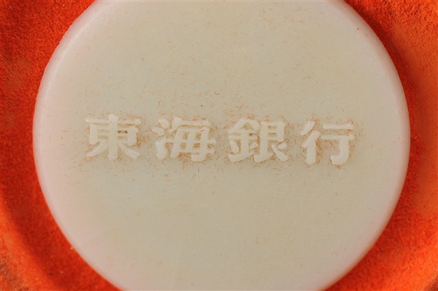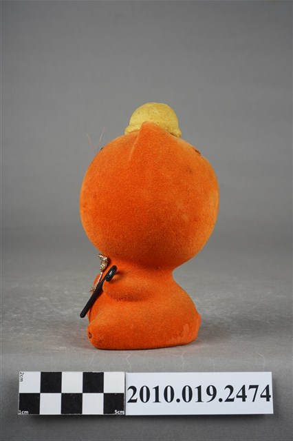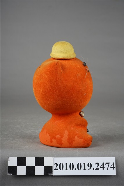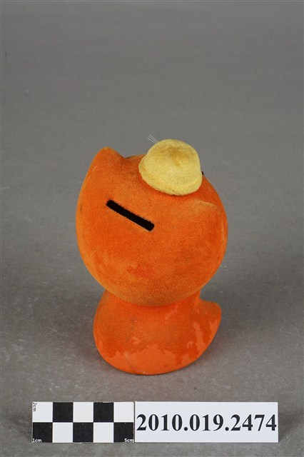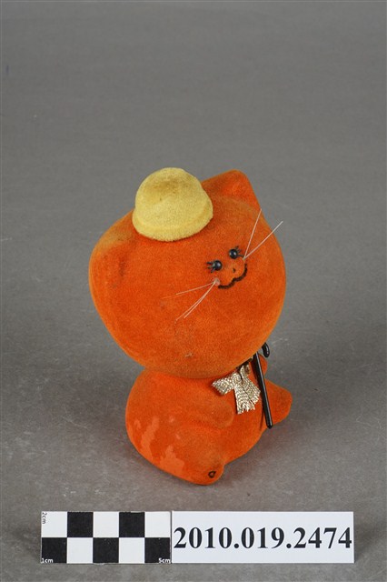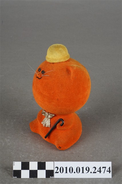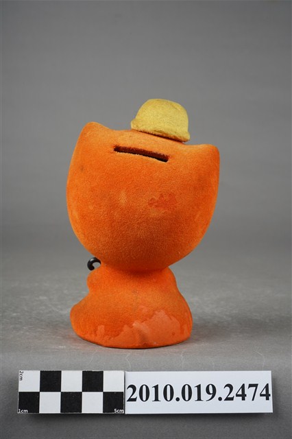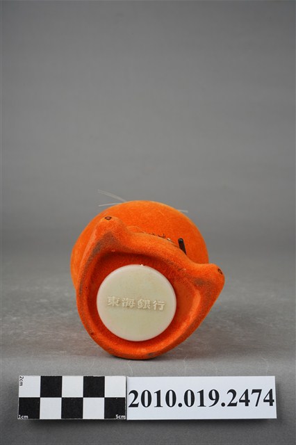 1.本物件為東海銀行貓造型陶瓷錢筒,整體為橘色的貓,胸前戴有蝴蝶結,左手拿著拐杖,頭上戴著黃色帽子。背面有投幣孔,底部為有設計將錢幣取出之圓形口,寫有「東海銀行」。