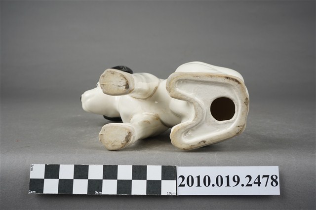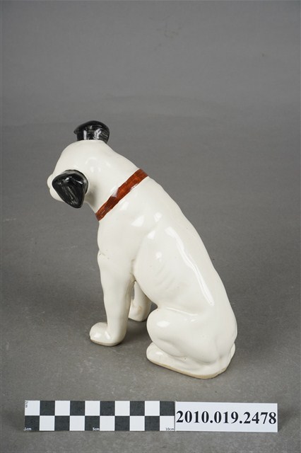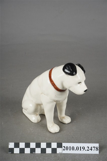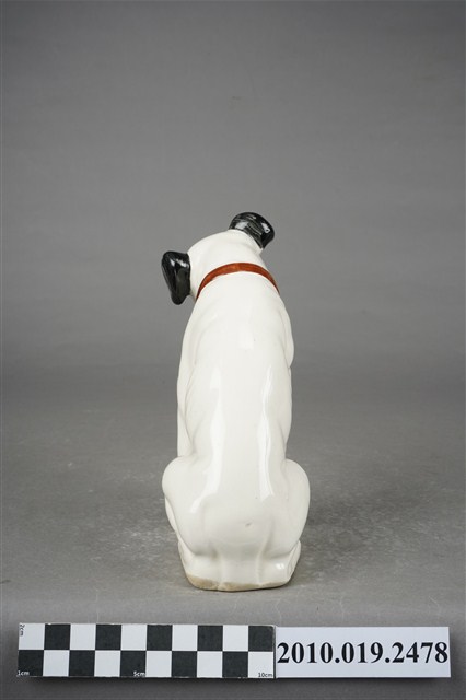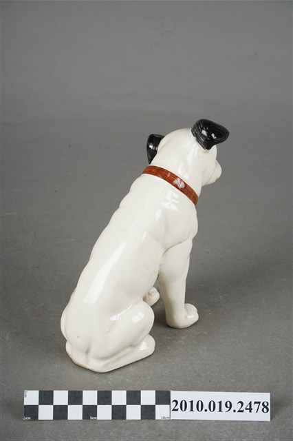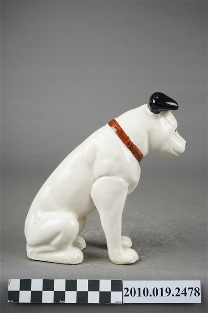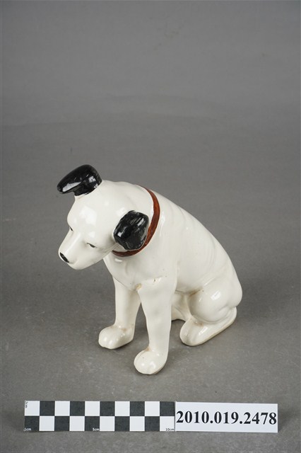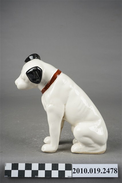 1.本物件為JVC勝利狗陶瓷擺飾,材質為陶瓷,樣式為一隻穿戴紅色項圈的黑耳白狗,頭部稍微往左傾斜呈現坐姿。