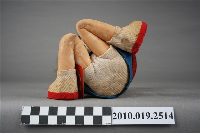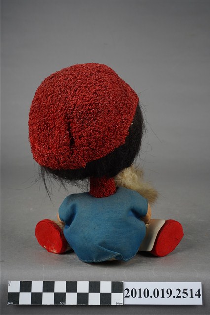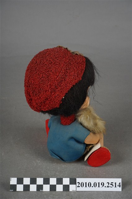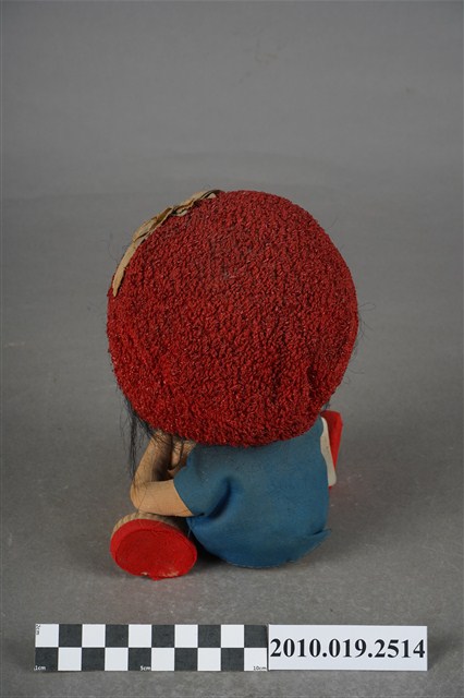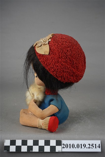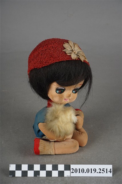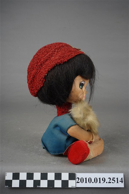 本物件為黑髮女孩玩偶,呈跪坐姿勢,其頭戴鑲花之紅色軟帽,身著藍色T恤,腳穿紅鞋,左手拿有米白色羽飾,眼睛為黑色並帶有藍、紅、綠色等色彩,嘴唇為粉紅色。