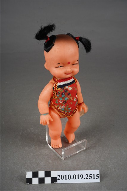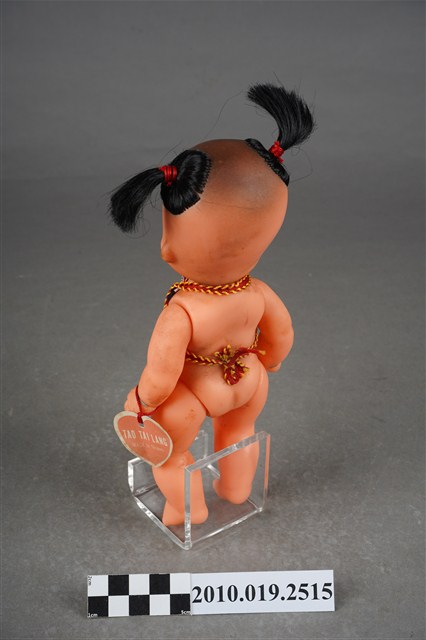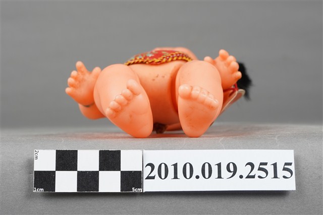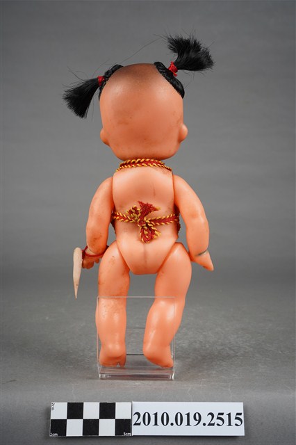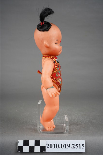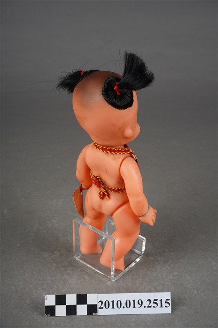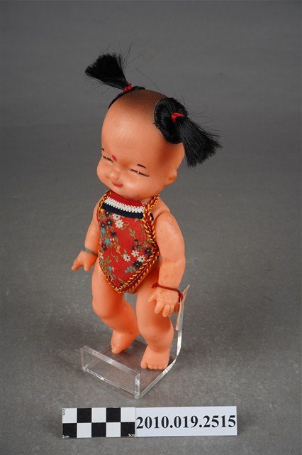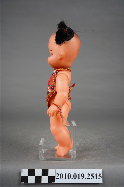 1.本物件為哪吒造型玩偶,呈站姿,頭髮為雙馬尾,眉心有紅色圓點,表情為開心微笑,身著繡有白、藍、紫色花紋之紅色肚兜,左手手腕掛有紅色束帶之飾品。2.哪吒是中國古典神話小說《封神演義》中的人物,傳說為靈珠子投胎,母親懷孕三年六個月後才出生。哪吒三太子失手打死東海龍王三子敖丙,為了不連累父母,割肉還母、剔骨還父,當場自戕。而後太乙真人用蓮花蓮藕為他造了一個新的肉體。重生後的哪吒助姜子牙討伐紂王,憑著高強的武功和法寶多次立下奇功。