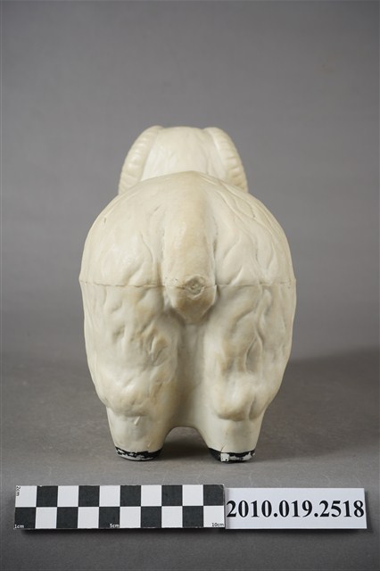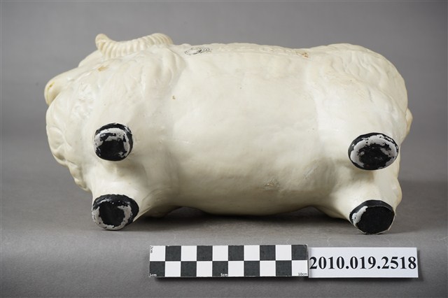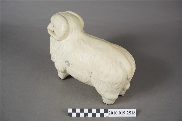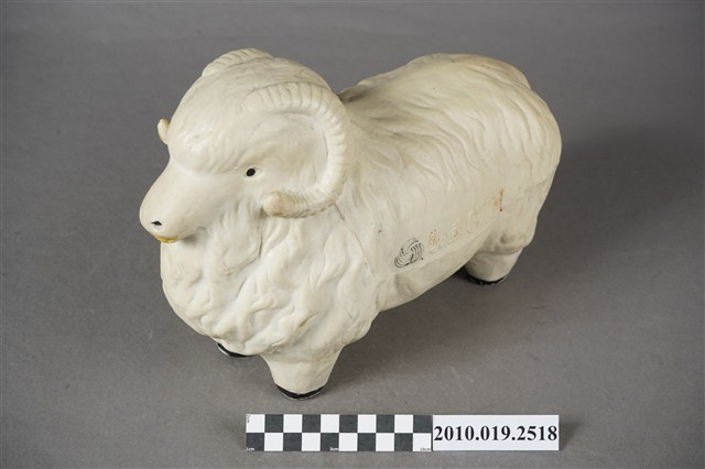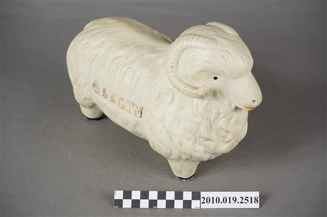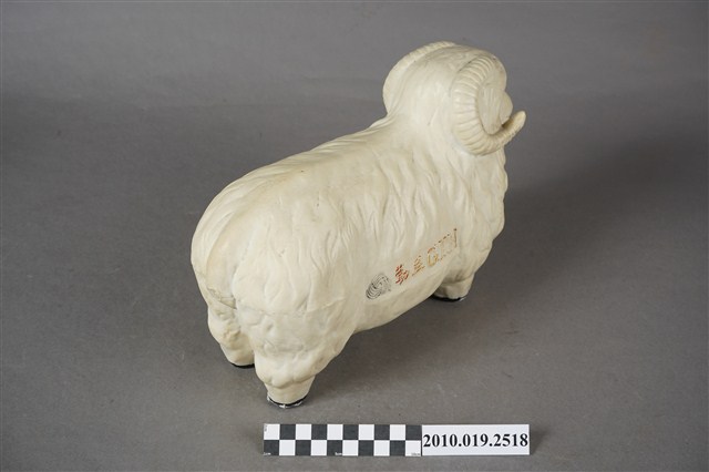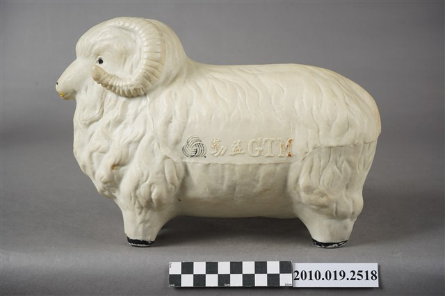 1.本物件為勤益羊擺飾,外觀為白色綿羊造型,材質為石膏製,眼睛與鼻子為開洞方式呈現,嘴巴塗有黃色顏料,羊角為白色,身體兩側印有勤益商標及「勤益GTM」之字樣,羊蹄為黑色。2.勤益投資控股股份有限公司,於1951年以「臺灣勤益紡織廠有限公司」名稱申請成立,主力生產紡紗、織布,並開發羊毛被、內衣及成衣等商品,而後也往電子類產業發展,2014年申請更名為「勤益投資控股股份有限公司」。